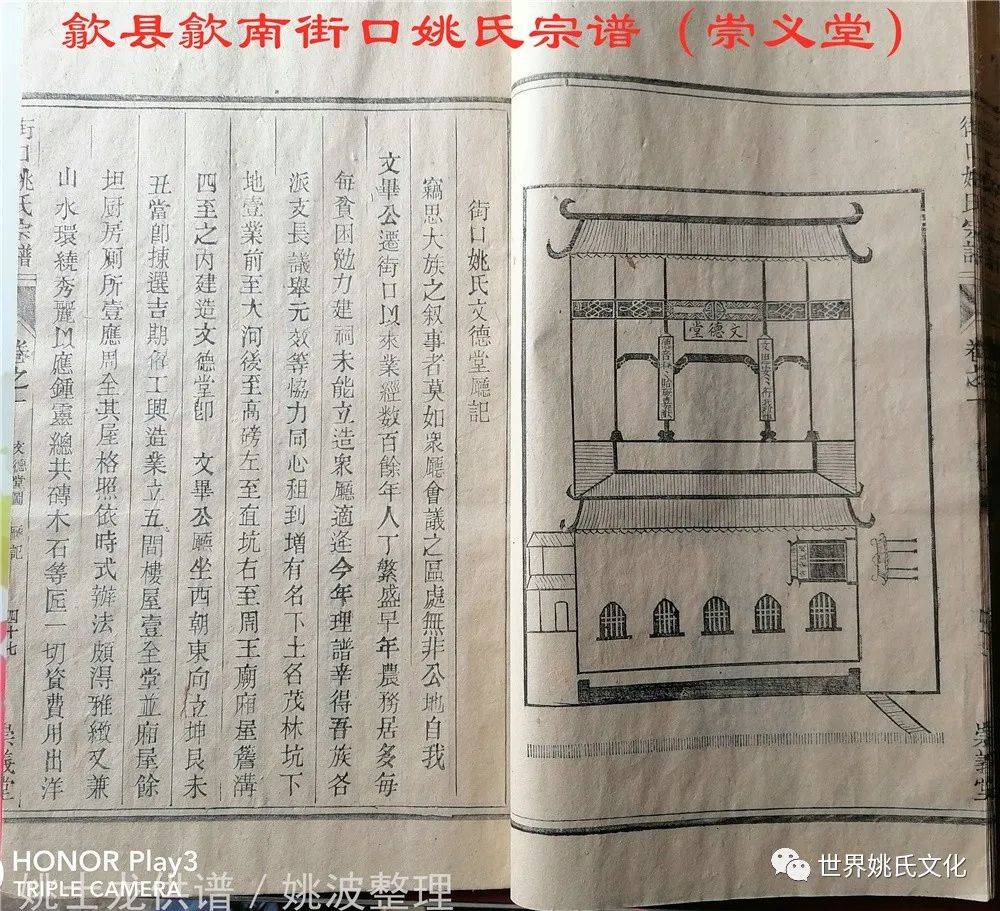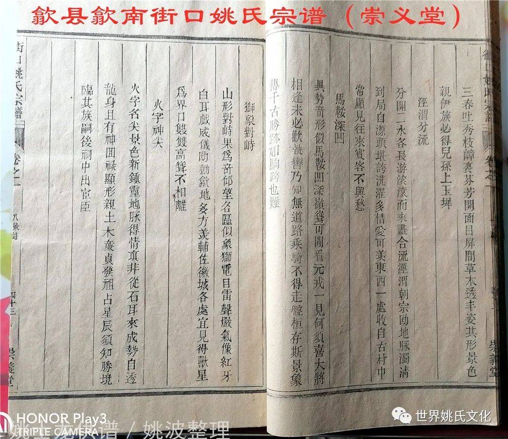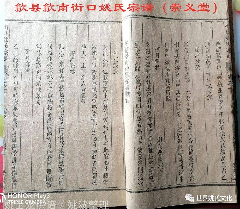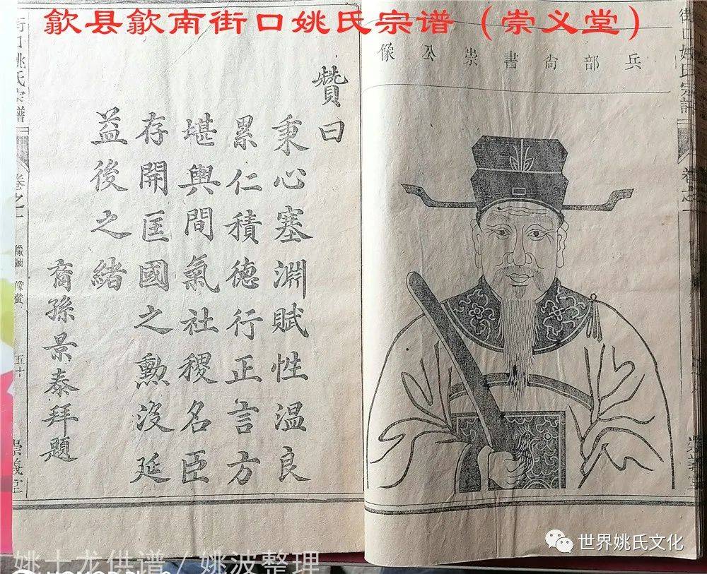 凡例、像赞、圣旨、貌图、墓图、诗集。姚氏迁派地名总图地集、歙南姚氏迁派图。崇义堂图祠记,文德堂图厅记,像赞引。鼻祖舜帝像、姓原郡望,兵部尚书崇公像赞,街口始祖姚文毕像赞等。