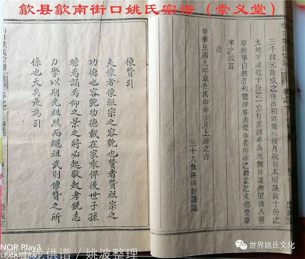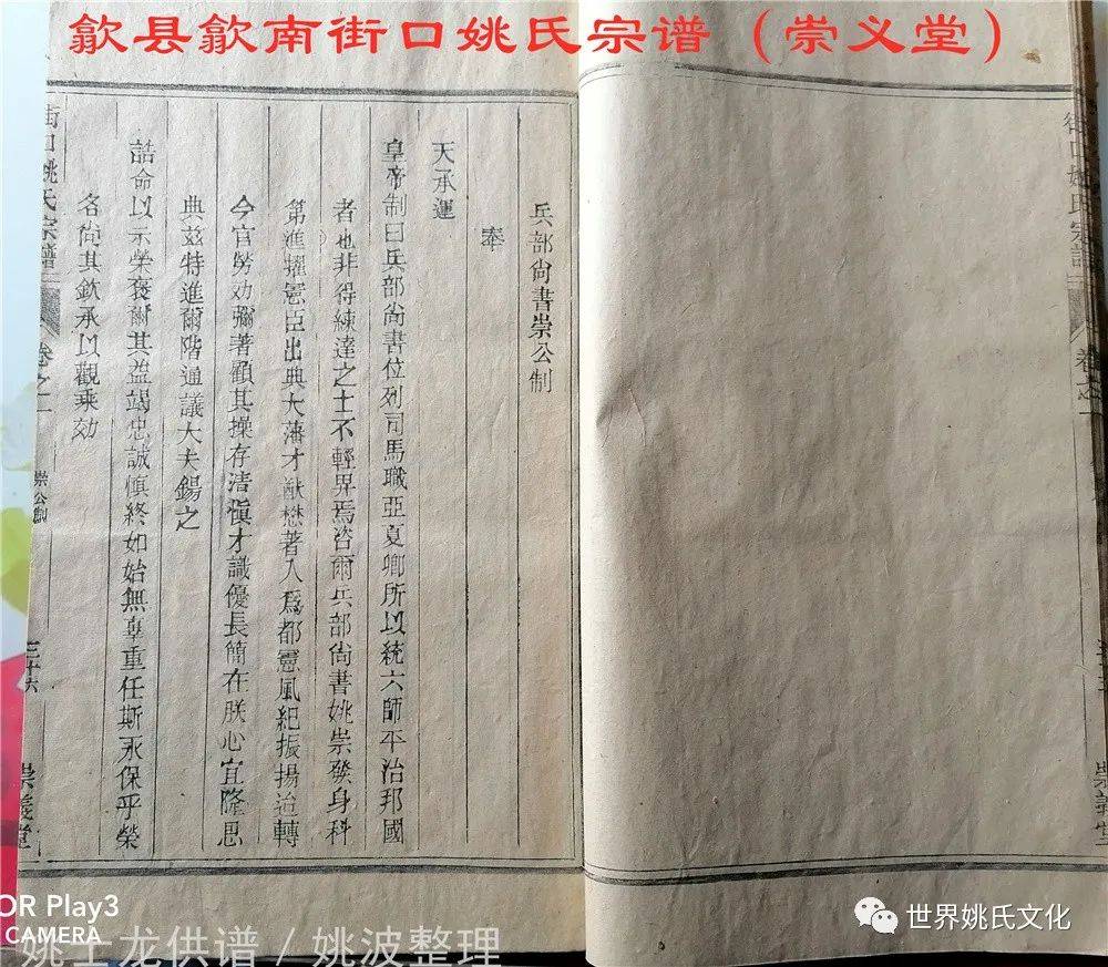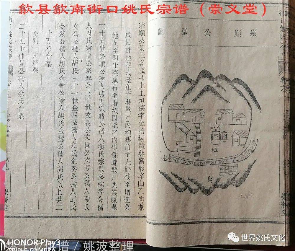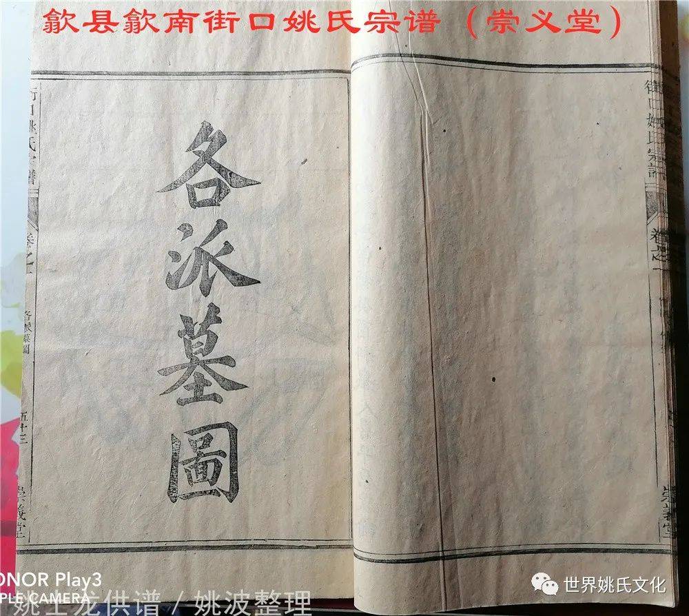 凡例、像赞、圣旨、貌图、墓图、诗集。姚氏迁派地名总图地集、歙南姚氏迁派图。崇义堂图祠记,文德堂图厅记,像赞引。鼻祖舜帝像、姓原郡望,兵部尚书崇公像赞,街口始祖姚文毕像赞等。