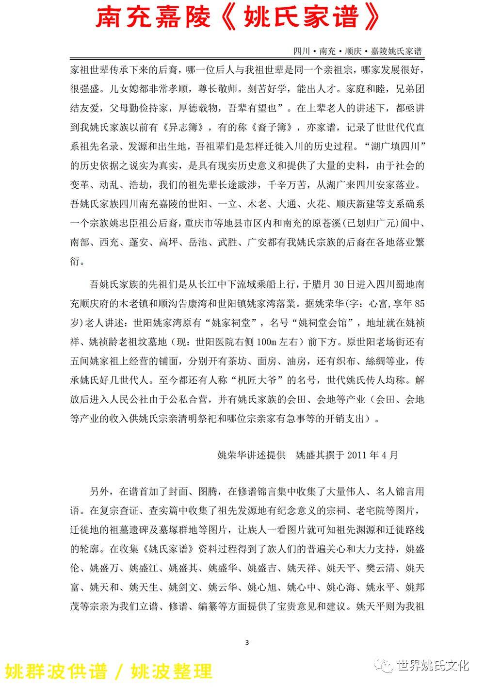 2015年4月由姚盛其宗亲等组成的寻根小组到湖北寻访查证:我入川老祖姚祯祥、姚祯龄宗亲等一支系的老祖们,是洪武二年从江西南昌府新昌县天德乡二十五都灵源斗门迁到湖北省麻城县孝感乡白玉村(白叶村),再度迁入四川省南充府,聚业于木老、世阳等地聚生繁衍发展至今。