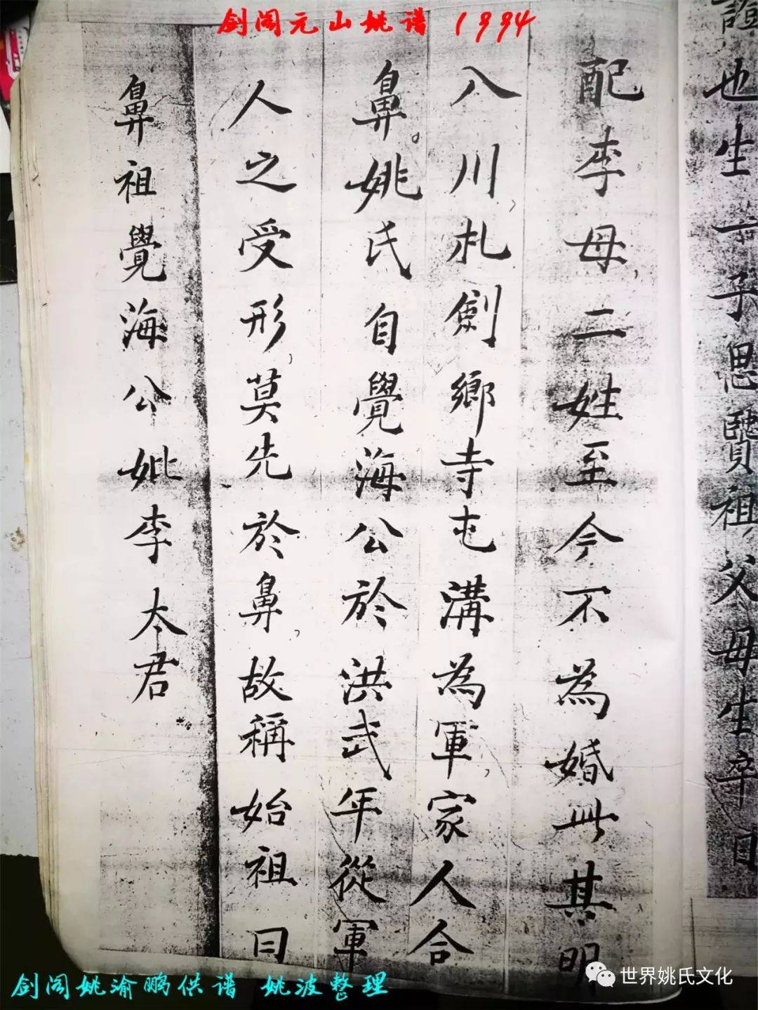 始迁祖:觉海;(入川时间无记录,待考)妣李太君;生子思贤。洪武年间从军入蜀,擂剑乡寺屯沟为业,未带谱入川。口称原籍陕西西安府富平县八角嘴刘谷村。明末罢兵为民,12世孙杰菴公(姚俊)再迁卜市侧。