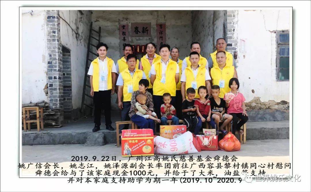 9月22日,广州江高姚氏慈善基金舜德会姚广信会长,姚志江,姚泽源副会长等一行率团前往广西容县黎村镇同心村,自驾近千公里,只为支助特困姚氏家人,送去浓浓的真情;