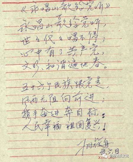 “诗文是一个应时应景的东西,《唱支山歌给党听》反映了当时人们对共产党带来新生活变化由衷的感谢和对党的热爱,《永唱山歌给党听》则是人们对美好生活的期待和向往。”他现在回想当年,曾经的愁苦与愤懑,已经成为历史的蹉跎,如今的生活环境和以前已是天壤之别。总结就是"发已千层白,心犹一寸丹;《山歌》传儿孙,余热献给党。