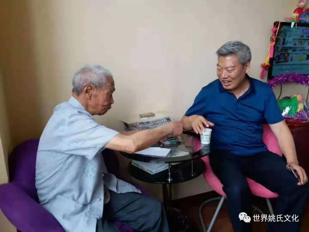 陕西姓氏文化研究会姚氏专业委员会长一行前往疗养院看望姚筱周宗亲,图为姚文礼会长与姚筱舟宗长(左)交流