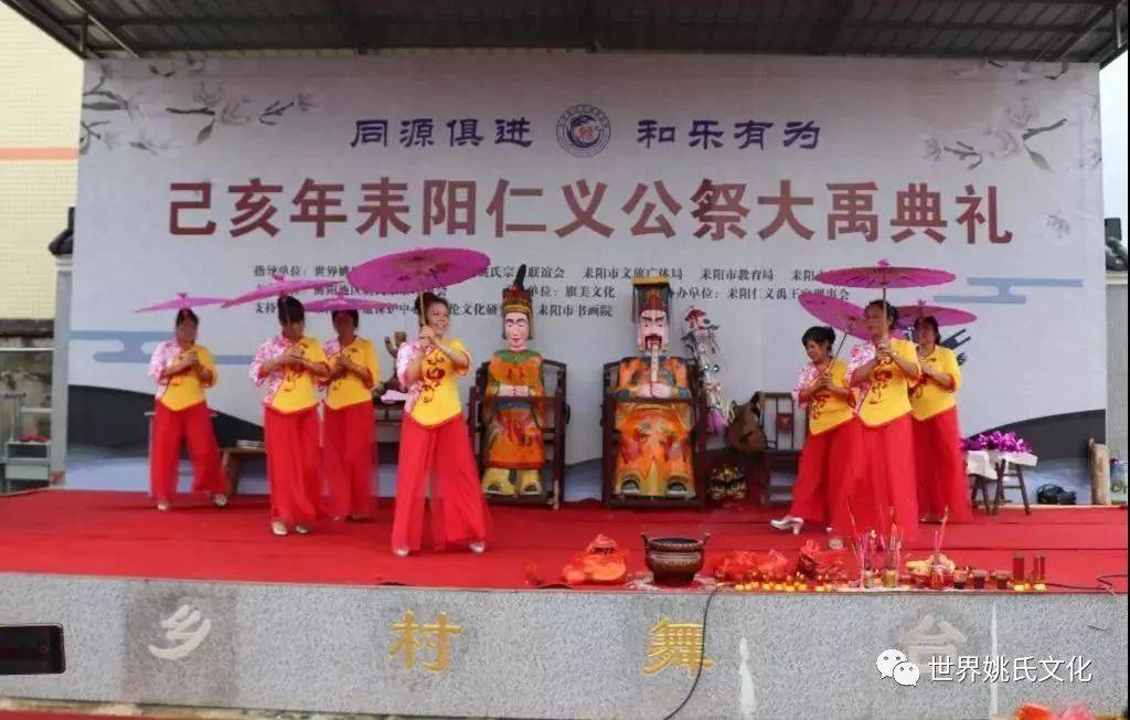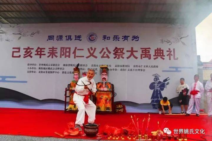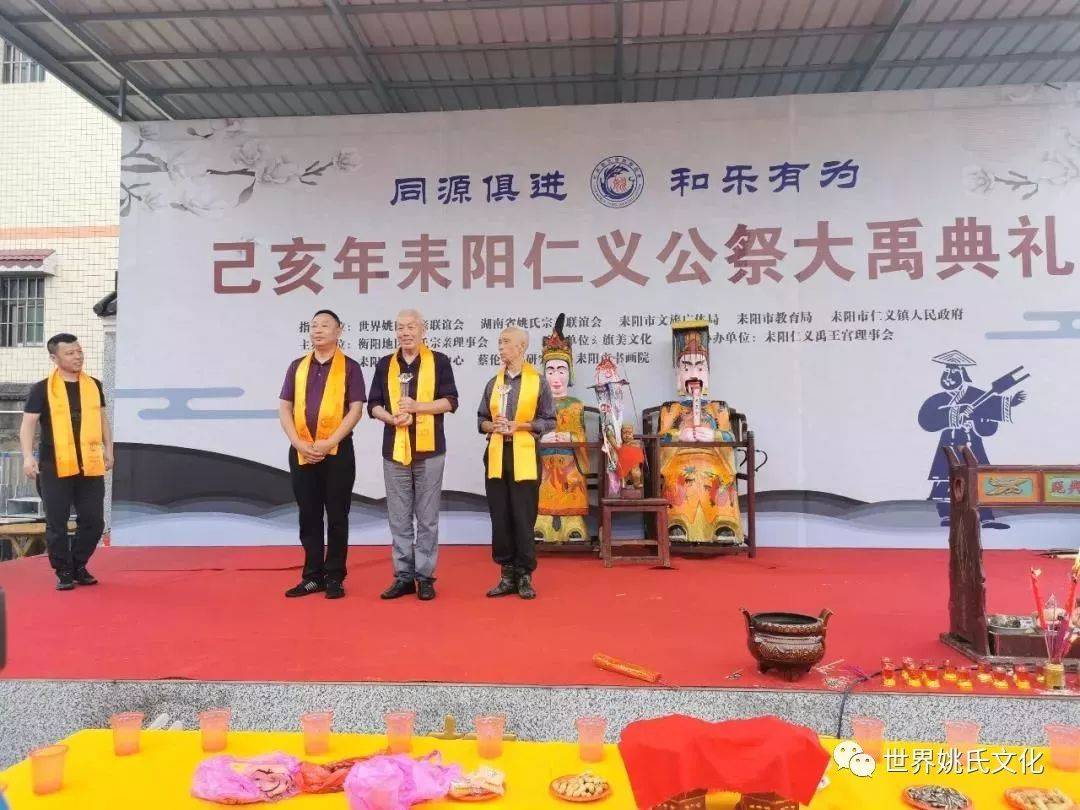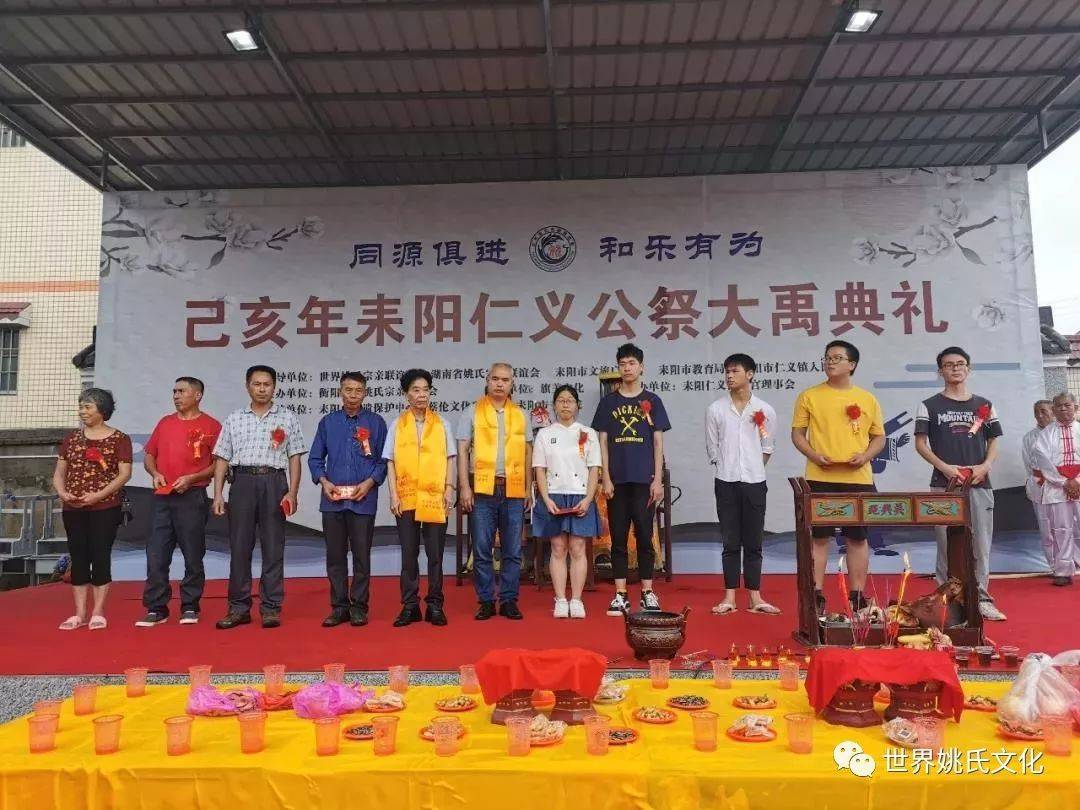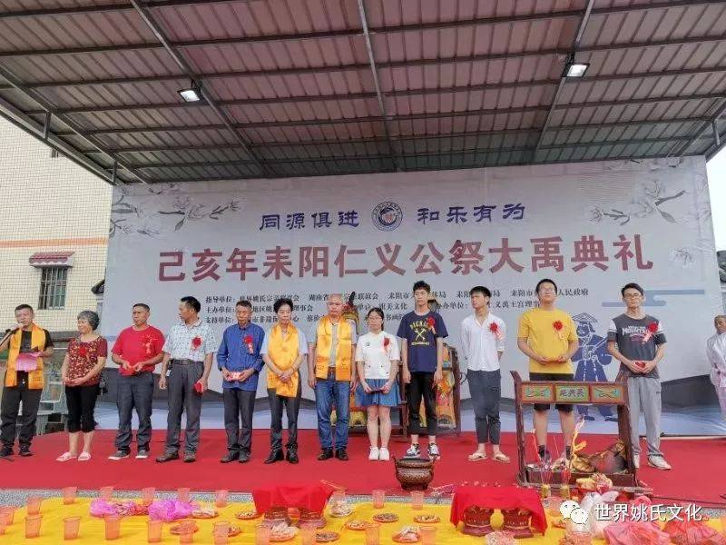 7月14日,农历六月十二,由衡阳地区姚氏宗亲理事会主办的己亥年耒阳仁义公祭大禹典礼、首届“仁义之光”非物质文化遗产展演活动在耒阳仁义镇衡头村盛大举行。此次活动得到了世界姚氏宗亲联谊会、湖南姚氏宗亲联谊会、耒阳市文旅广体局、耒阳市教育局、耒阳市仁义镇人民政府的悉心指导,得到了耒阳市非遗保护中心、耒阳市禹王宫理事会、蔡伦文化研究院、耒阳市书画院的大力支持,得到了衡阳日报、衡阳电视台、耒阳电视台、耒阳快讯等主流媒体的强势关注与支持。