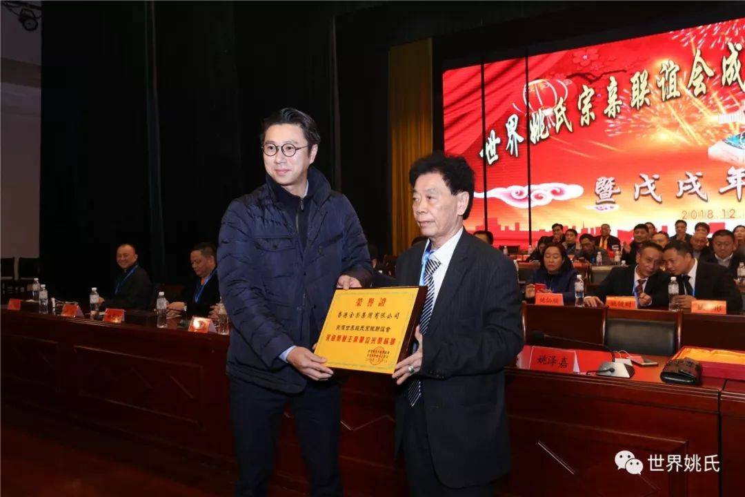 世姚会姚泽嘉主席为香港姚铨浩宗贤授“永远荣誉主席”荣誉牌,姚铨浩宗贤将捐资2021年18万元助学资金
