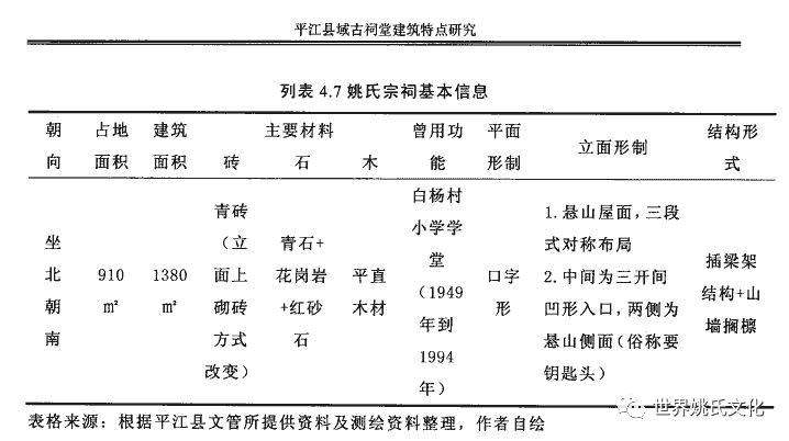 姚氏宗祠位于平江县伍市镇白杨村七组,东距平江县城42公里,据《姚氏族谱》记载始建于清嘉庆10年。解放后,1949年到1994年间,整个祠堂用于白杨村小学学堂。姚氏宗祠所在的白杨村被文化部命名为“九龙舞艺术之乡”。白杨村村民姚姓占主体,已公布为国家级非物质文化遗产的“九龙舞”即为姚姓人传承。而姚氏宗祠作为姚氏族人祖祖辈辈传承练习九龙舞的主要场所,姚氏宗祠仍保留有戏台、厢房、青石板天井等,主体结构完整,在平江西乡是少见的保留完整的祠庙建筑。