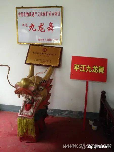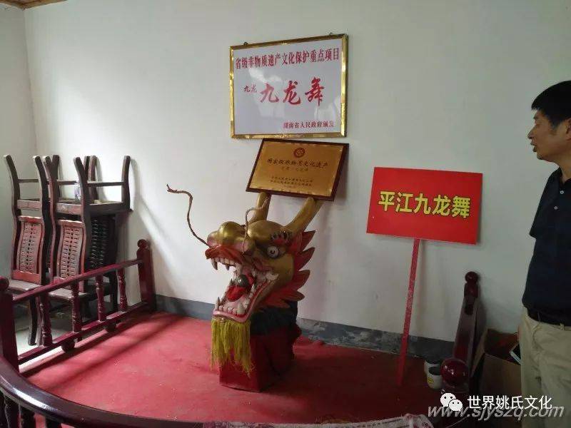 平江县伍市镇白杨村姚氏宗祠就有支九龙舞,流传千年,上世纪90年代开始名扬中外,享有盛誉。从闭塞的小村庄到走上新农村建设的康庄大道,白杨村姚氏因九龙舞悠久的历史,丰富的内涵和深厚的艺术底蕴,演绎着古老而又富有现代气息的神话传奇。 从汉朝演绎至今的九龙舞随着时代的发展,经一代又一代艺人的不断推陈出新,九龙舞表演套路由简到繁,由粗到精,已形成了独特的表演艺术形式,在中国龙舞中可谓独树一帜。