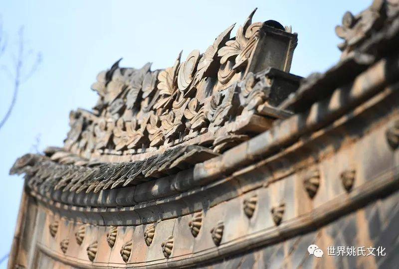 如今一把铁锁锁着姚家祠堂的大门,但高耸在屋脊上的双层缠枝宝相花砖雕远远看去异常精美。穆民说:“清代关中道上大户人家的房子屋脊上都会装饰脊兽,姚家是远近闻名的富户,祠堂盖得更为气派。除了脊兽还专门定制了宝相花纹饰的砖雕放置在屋脊上,而且一放就是两层。”