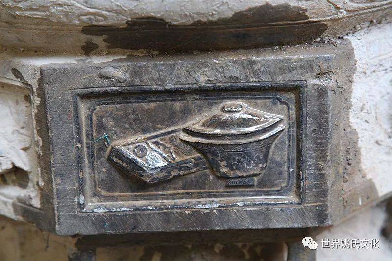 泾阳出茯茶,清代时姚家是泾阳富商,生意涉及生丝、棉纱、白蜡、茶叶和中药材,自然也是大茶商。穆民说姚家主要在康定和雅安做茶叶生意发家,最兴旺时字号遍布全国各地,在苏州、四川等地都有姚家的字号,甚至尼泊尔也有姚家的字号。姚家崇尚儒商,柱石上刻的也多是琴棋书画、梅兰竹菊等画面,但不同于传统的内容,祠堂内的柱石和大门口的柱石上还刻着多幅茶壶、茶碗组成的画面。