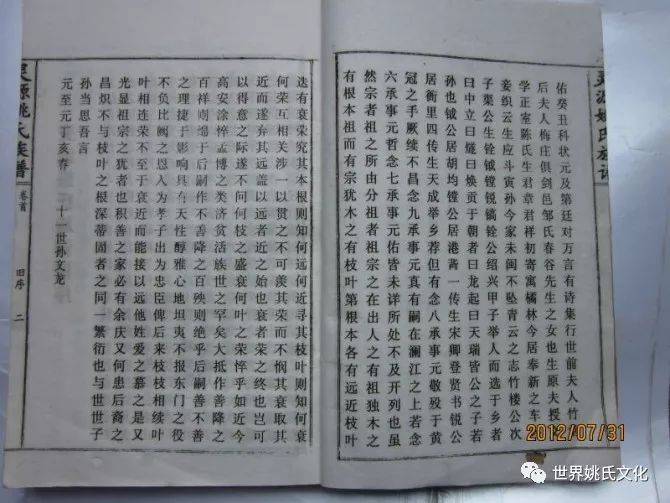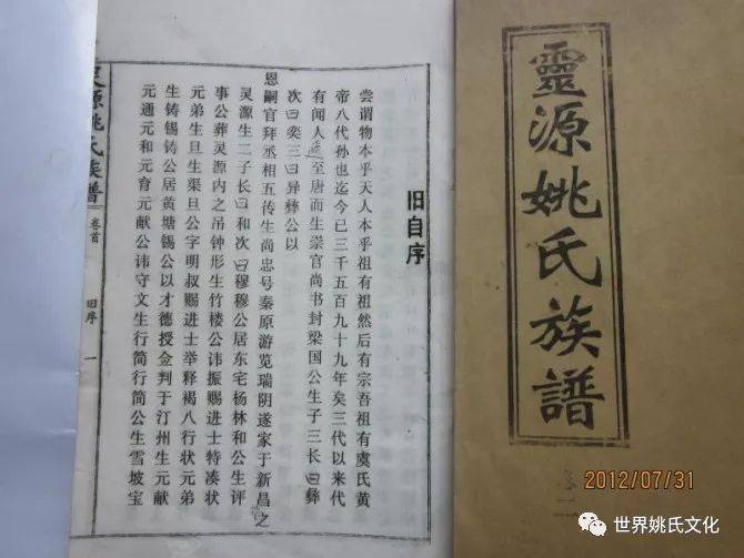 尝谓物本乎天,人本乎祖,有祖然后有宗。吾祖有虞氏,黄帝八代孙也,迄今三千五百九十九年矣。三代以来,代有闻人。遁至唐而生崇,官尚书封梁国公,生子三:长曰彝,次曰奕,三曰异。彝公以恩嗣官拜承(丞)相。五传生尚忠,号秦原,游览瑞阴,遂家于新昌之灵源。生二子:长曰和,次曰穆 。穆公居东宅杨林。和公生评事公葬灵源内之吊钟形。生竹楼公,讳振,赐进士特奏状元弟(第),生旦,生渠。旦公,字明叔,赐进士举,释褐八行状元弟(第)。生铸、锡。 铸公居黄塘。锡公以才德授佥判于汀州。 生元献、元通、元和、元育。元献公讳守文,生行简。行简公生雪坡, 宝佑癸丑科状元及弟(第),廷对万言,有诗集行世。前夫人竹△、后夫人梅庄俱剑邑邹氏春谷先生之女也,生原夫,授文学。正室陈氏,生君章、君祥。初寄寓橘林,今居奉新之车△。 妾织云,生应斗、寅孙,今家未闽,不坠青云之志。 竹楼公次子渠公生铨、 钺、 镗、 锐、 镐。 铨公绍兴甲子举人。而选于乡者:曰中立,曰燧,曰焕;贡于朝者:曰龙起,曰天瑞,皆公之子、若孙也。 钺公居胡均。镗公居巷背,一传生宋卿登贤书; 锐公居衙里,四传生天成,举乡荐。但有念八承事(嗣)元敬殁于黄冠之手,厥续不昌 。念九承事(嗣)元真有嗣在澜江之上。若念六承事(嗣)元哲、念七承事(嗣)元佑,皆未祥所处,不及开列也。虽然宗者,祖之所由分,祖者祖宗之在出。人之有祖,独木之有本,祖而有宗,犹木之有枝,叶第根本,各有远近。枝叶迭有衰荣,究其本根,则知何远何近。寻其枝叶,则知何衰何荣。互相关涉,一以贯之,不可羡其荣而不悯其衰, 取其近而遂其远。盖以远者近之始也,衰者荣之终也。岂可以得意之际,遂不问何枝之盛衰,何叶之荣悴乎?如近今高安涂悴孟博之类,济贫活族世之罕矣。大抵作善降之百祥,则绵于后嗣之恩。入为孝子,出为忠臣。 俾后来枝枝相续叶叶,荣不至于衰,近而能接以远。他姓爱之慕之,是又光显祖宗之犹者也。积善之家,必有余庆,又何患后裔之昌炽,不与枝叶之根深蒂固者之同一繁衍也? 与世世子孙当思吾言。