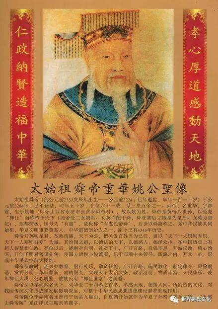 姚氏始祖舜帝。舜帝,姓姚,传说目有双瞳,取名“重华”,号有虞氏,故称虞舜。舜是开创中华民族人类文明的五帝之一,道德文化的创始人。司马迁《史记——五帝本纪》中所载:“天下明德,皆自虞舜始”。他的道德品质被后人誉为“民师帝范”、“人伦楷模”。