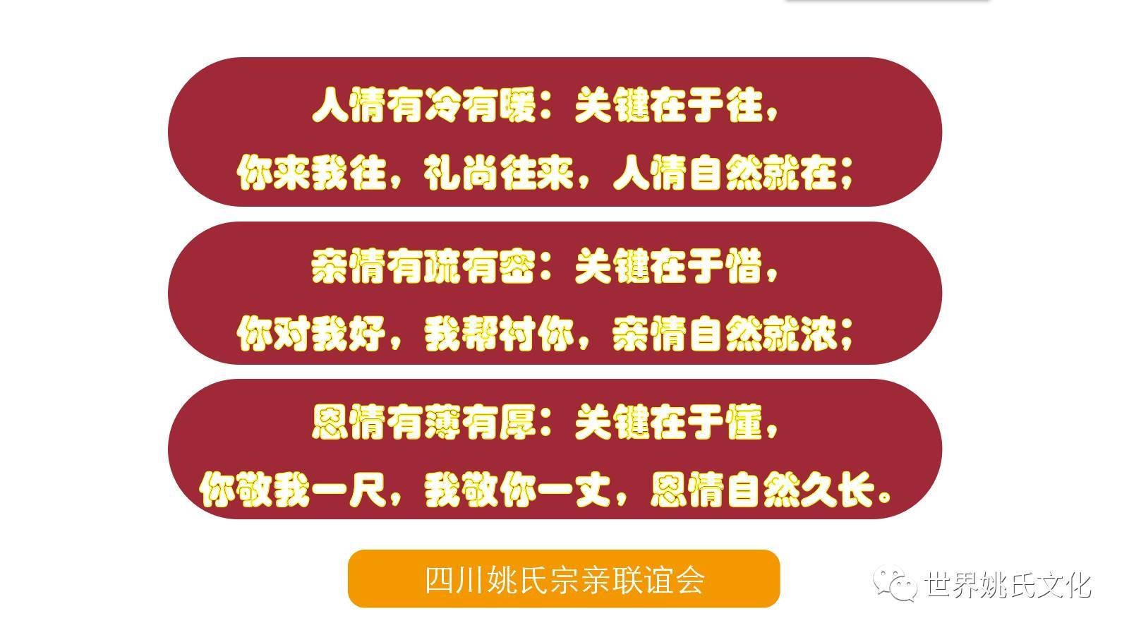 重庆姚氏终身不忘天下姚姓一家亲,川渝族亲血样淳,根系发达枝叶茂,德孝传承竹根垠。回想老四川姚氏宗亲会五年来的血脉之情,同宗共祖之谊,为重庆困境中的姚氏宗亲对口帮扶的各地族贤心怀感恩,同为一脉相承的姚氏家族,纵横联谊,敦亲睦族,促进发展表示衷心感谢。是在你们的辛勤耕耘下,使老四川姚氏宗亲联谊会成为巴山蜀水姚氏发展历程中的一道靓丽的风景。