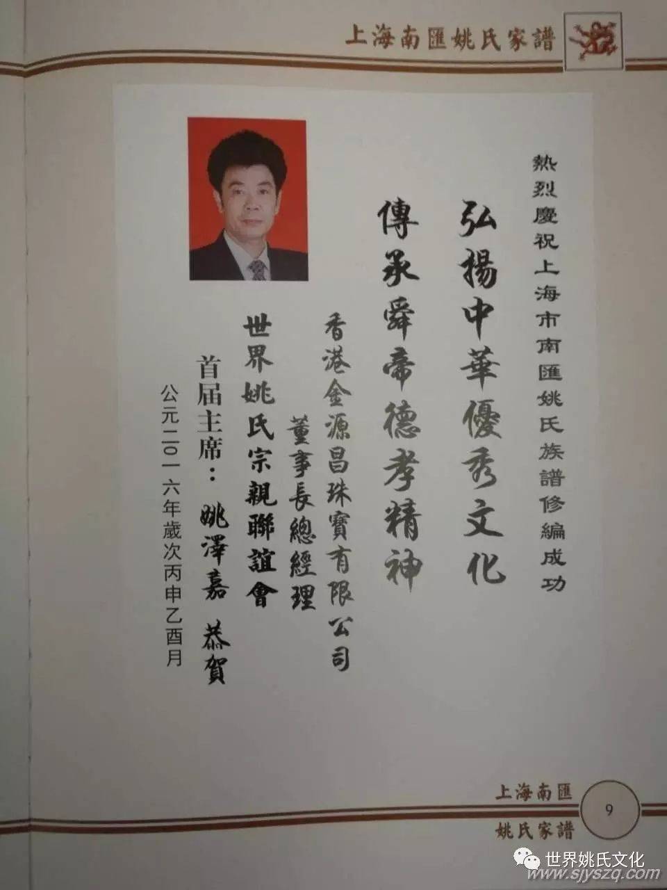 在此,我代表世界姚氏宗亲联谊会,向南汇姚氏家族全体宗亲,向修建南汇姚氏家谱付出辛勤工作的全体修谱人员表示最崇高的敬意和诚挚的祝贺!祝愿南汇姚氏家族,人丁兴旺,财源广进,家庭和睦,幸福安康,万载兴盛!