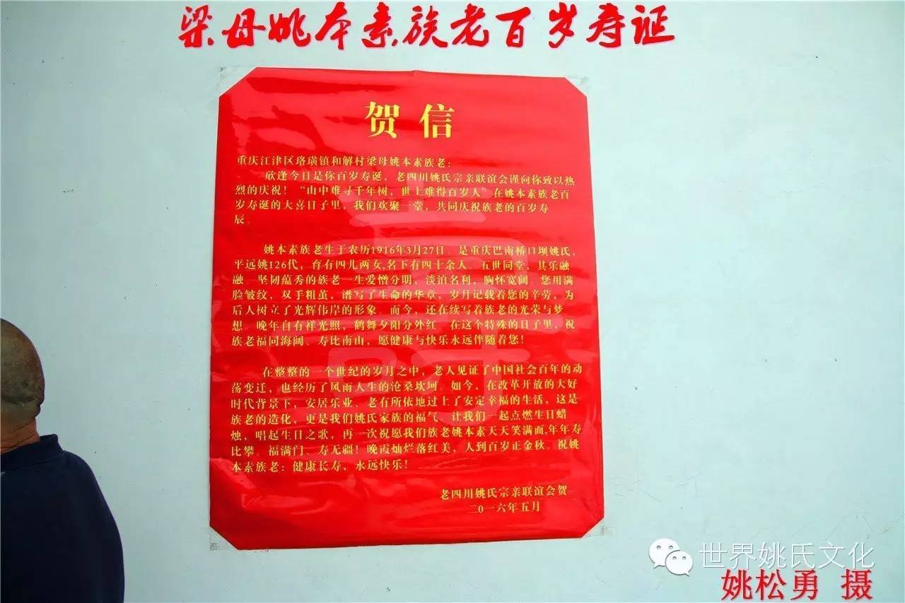 姚本素族老生于农历1916年3月27日。是重庆巴南桥口坝姚氏,平远姚126代,育有四儿两女,名下有四十余人。五世同堂,其乐融融。坚韧蕴秀的族老一生爱憎分明,淡泊名利,胸怀宽阔。您用满脸皱纹,双手粗茧,谱写了生命的华章,岁月记载着您的辛劳,为后人树立了光辉伟岸的形象。而今,还在续写着族老的光荣与梦想。晚年自有祥光照,鹤舞夕阳分外红。在这个特殊的日子里,祝族老福同海阔、寿比南山,愿健康与快乐永远伴随着您!