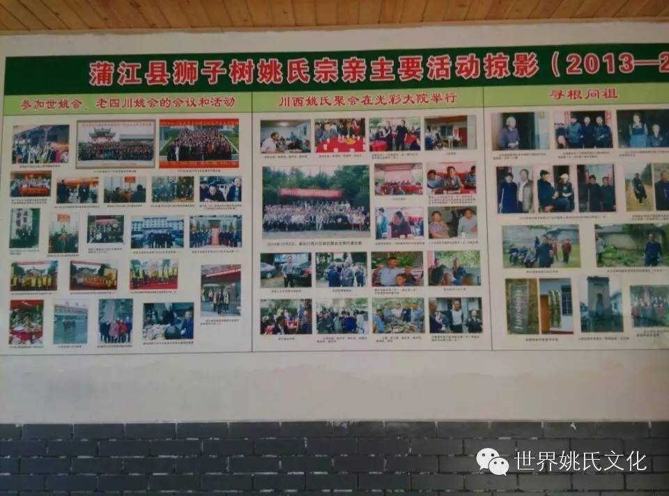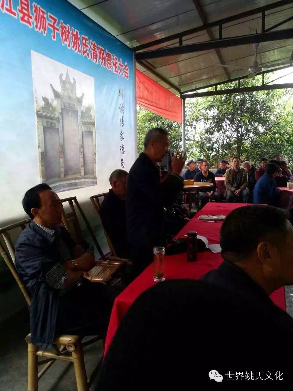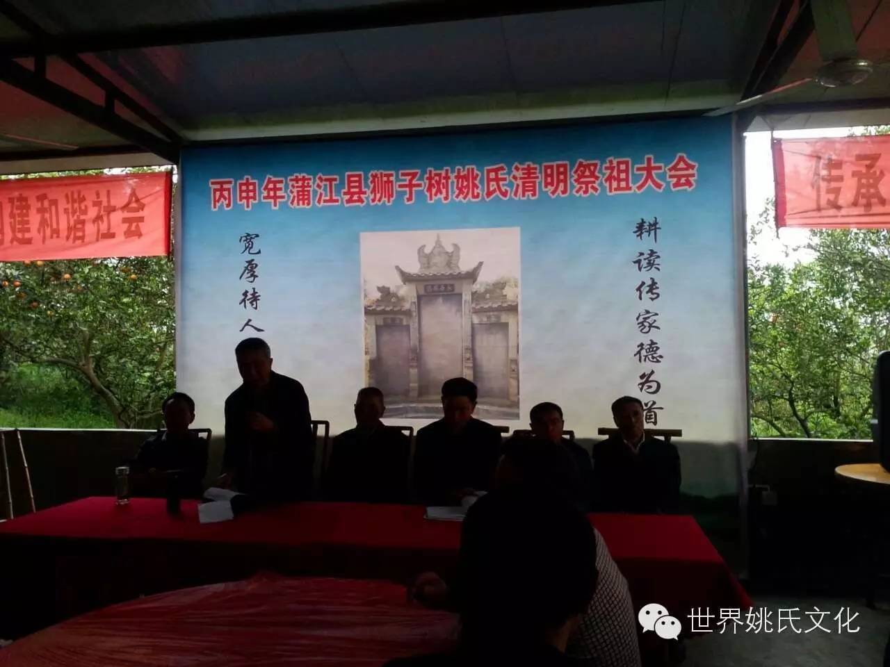2016年4月4日,蒲江县狮子树姚氏在光彩大院举行清明祭祖大会。参加这次清明祭祖大会的除了入川二世祖姚以贵、陈氏的后裔(其中名山黑竹5人、邛崃道佐2人)外,还有崇州姚林姚氏代表50人,大邑蔡场姚林姚氏代表28人,遂宁迁居蒲江代表1人,共计450多人参加了清明祭祖大会。