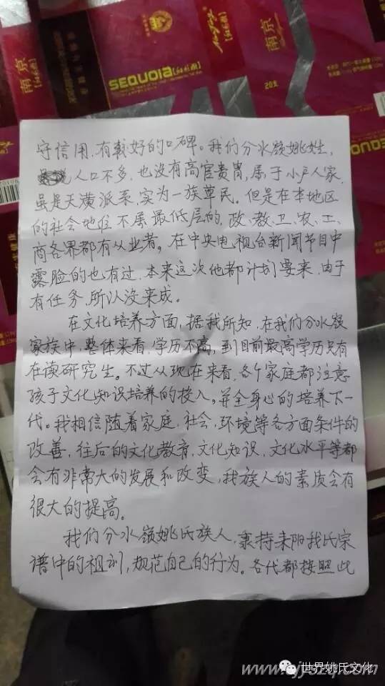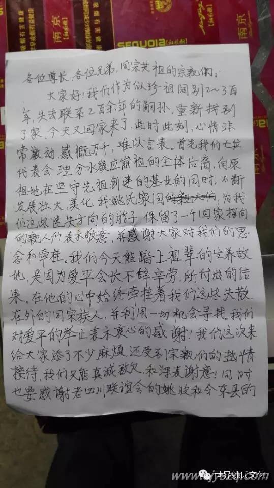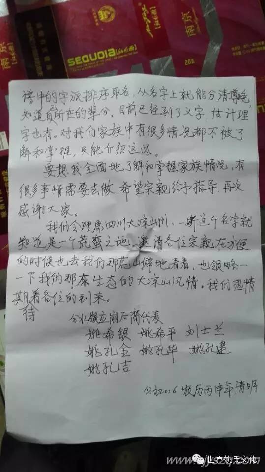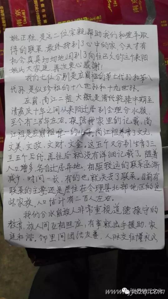 第四:2015年的5月份,我们宗亲会利用宗亲群这个网络平台,在老四川姚会和姚波宗亲的协助下,顺利的找到了我们离散了三百年的應賓公的后裔。
