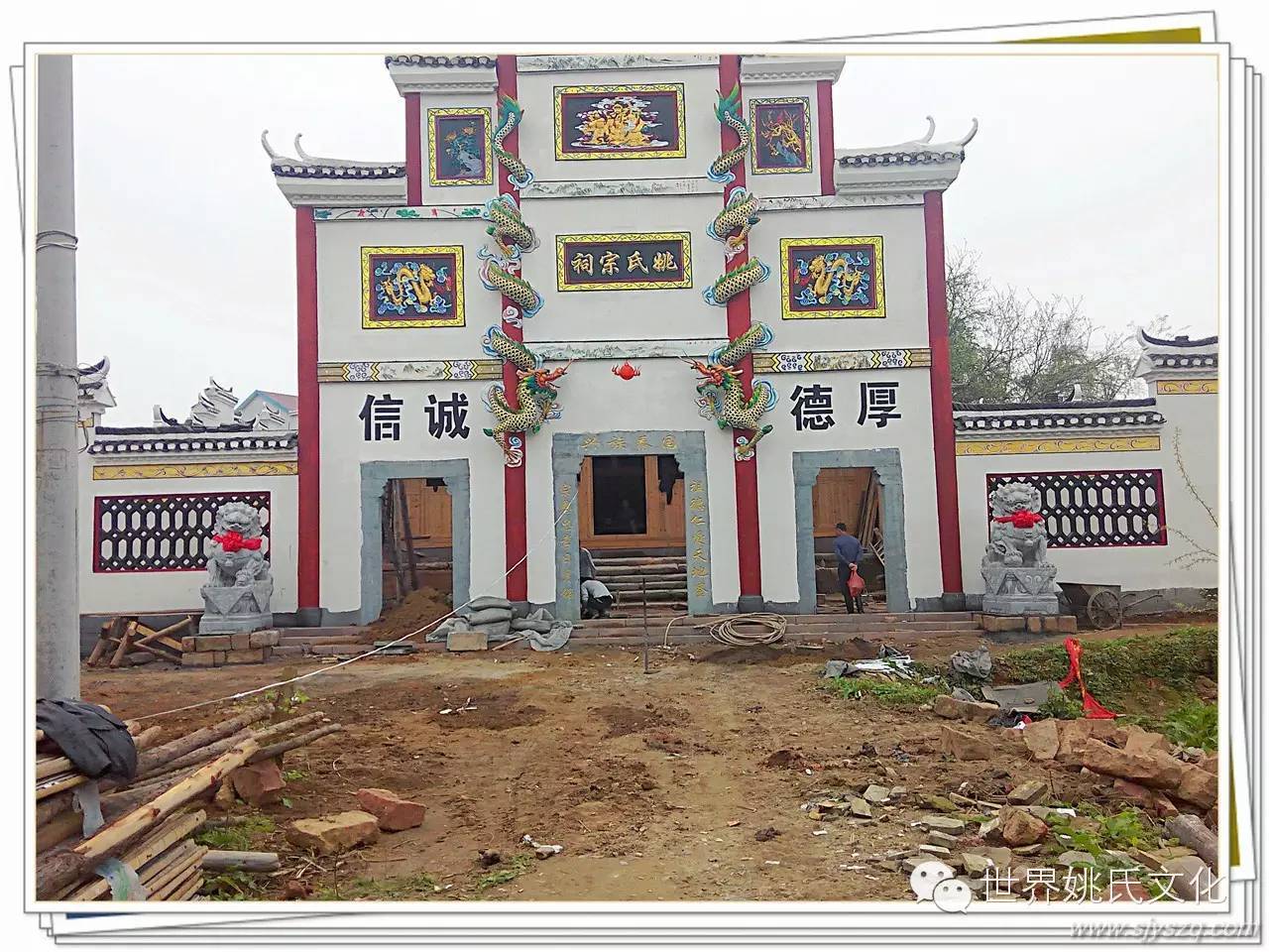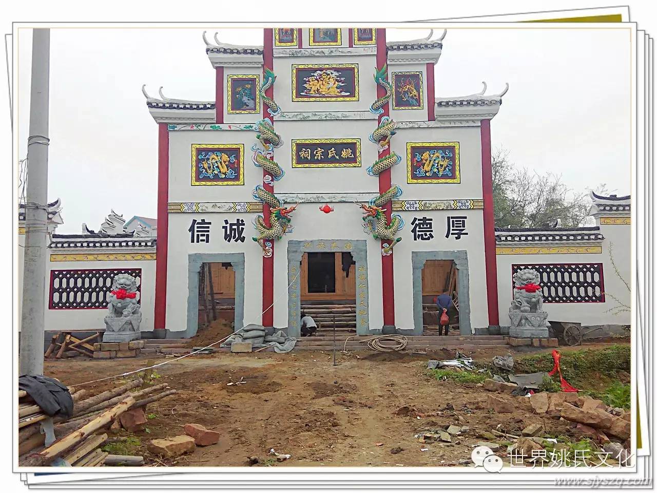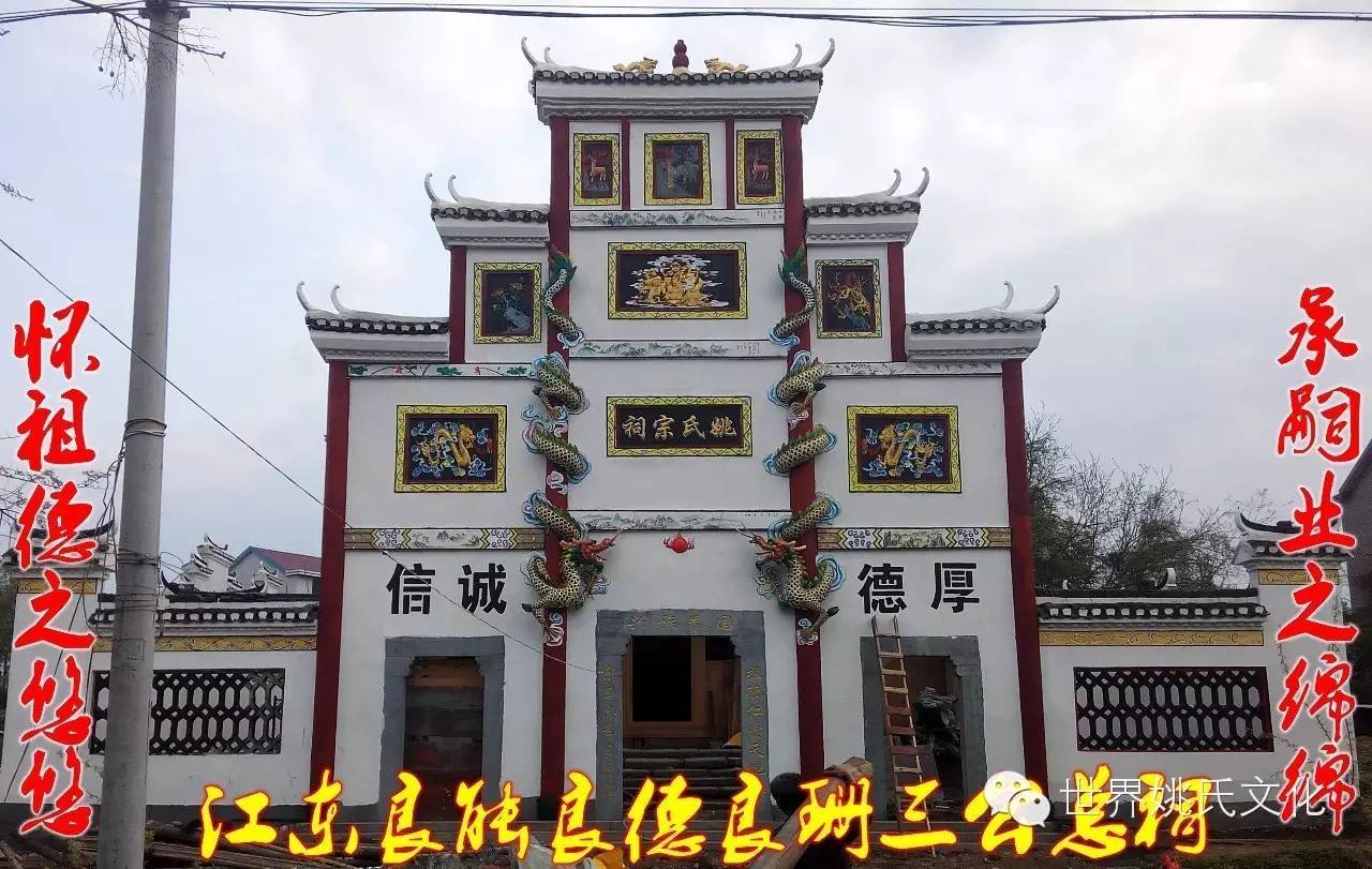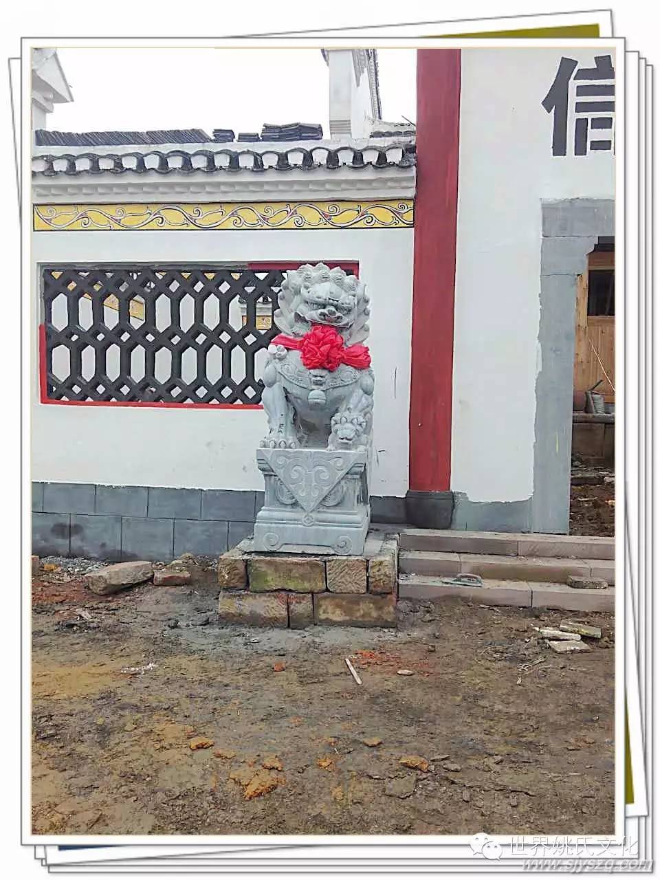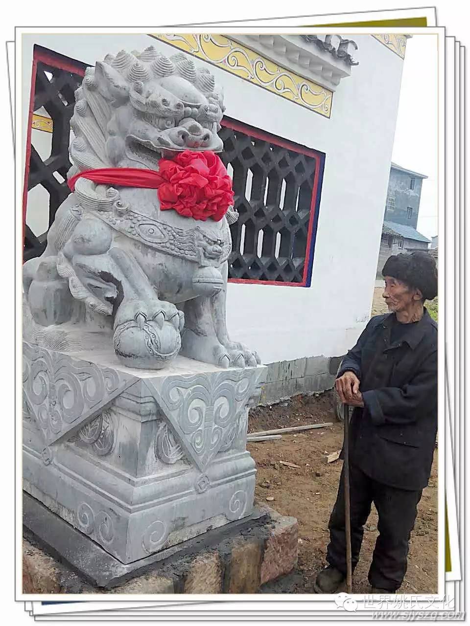 千百年来,在中国的民族文化里,祠堂门前石狮一直是守护人们吉祥、平安的象征。它不畏寒风烈日,脚踏实地,始终如一地与先辈相伴;它高贵、尊严,极具王者风范;它威武、吉祥,被奉为护家镇邦之宝。石狮子的形象特征和最能体现宗祠文化和农村的风俗民情,在人们的民俗生活中,石狮子不仅用来守卫大门,还用以镇宅、避邪、禁压不祥和保护村寨的平安。彰显祠堂重地的威严和尊贵,表达了族人对先辈的敬畏。所以祠堂放石狮子寄托了人们祈求石狮子能保佑族人平安的心理要求。强化族人的认祖归宗意识,提高族人凝聚力,饮水思源,励志后人。姚炉香烟,江东总祠。姚家祠堂重建,庆昌盛保兴旺。宗功浩大永泽帝舜裔, 祖德丕显长鞭后来人!
