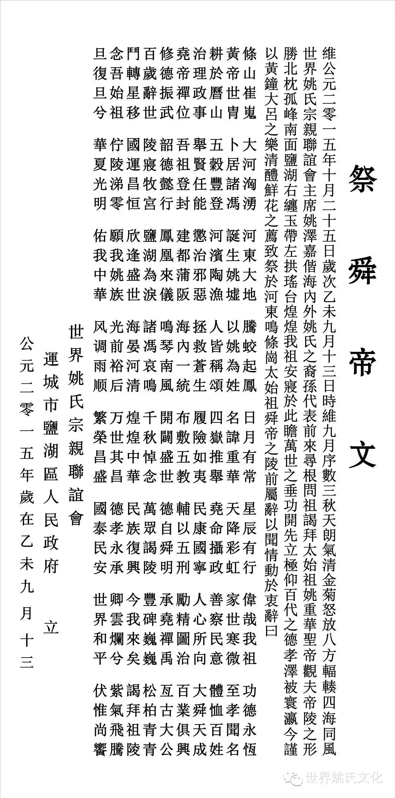 維公元二00八年九月廿五日,夏曆歲次戊子桂月廿六,時風和煦,乾坤仲秋。莘莘舜裔,綿綿瓜瓞,四方輻輳,聚集河東。情追虞帝懿德,心繫先祧聖地,世界舜裔宗親聯誼會主席陳捷中偕泰國、馬來西亞、新加坡、菲律賓、日本、印度尼西亞、緬甸、美國、加拿大、香港、澳門、台灣、河南、江西、福建、廣東等海內外舜裔宗親代表、河東父老及各方嘉賓共萬餘眾,謹以三牲五穀之薦,時花雅樂之儀,致祭于鳴條涑水之濱,長揖于始祖帝舜之陵前,曰: