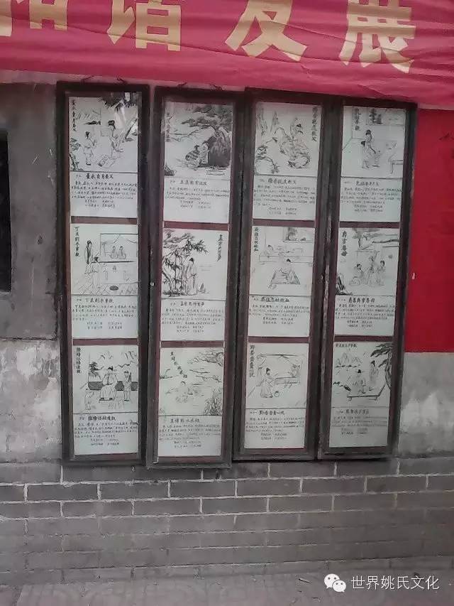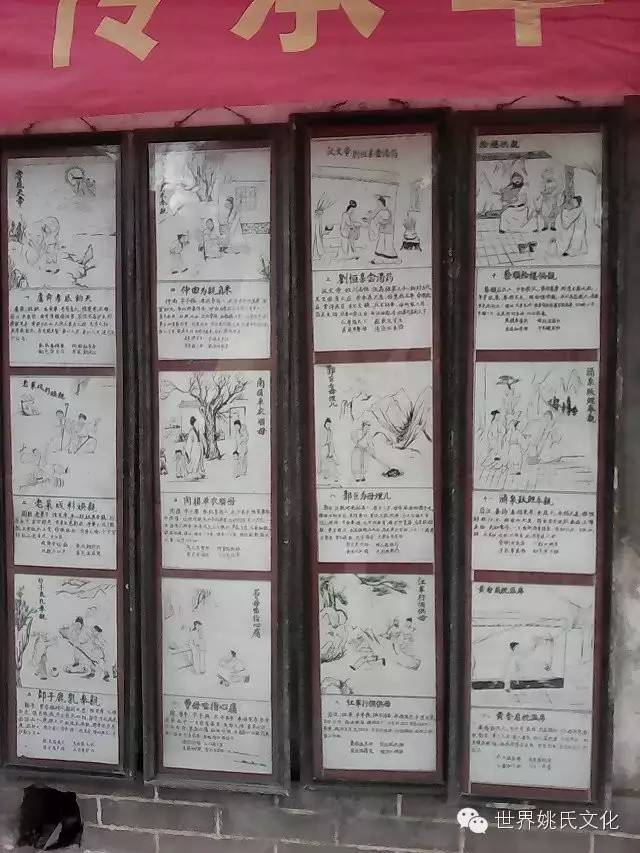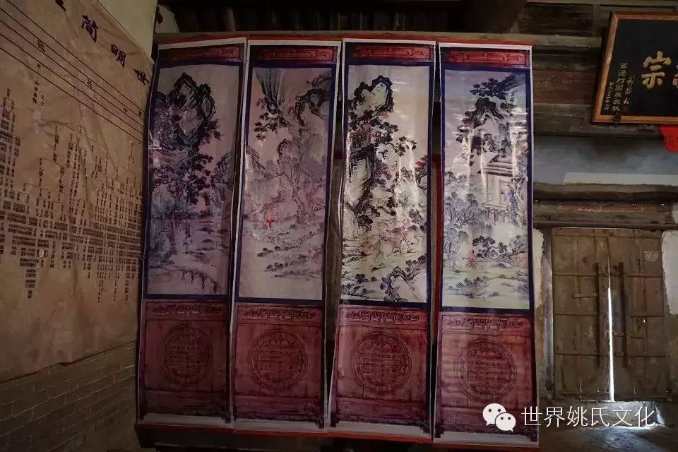 家庙的八扇屏是老族长姚泾州保存下来的。早在上世纪三四十年代,列强入侵,天下大乱。时任族长姚泾州见祠堂的东西难保,就将八扇屏搬到自己家的棚上,保护起来。历经战乱、土改、文革等几次大的浩劫,老族长冒着极大的风险,特别是土改期间,姚泾州家曾经被扫地出门过,但八扇屏却静静地躺在老族长的棚上安然无恙,直到上世纪八十年代祠堂重新开门时,(此时老族长已经离世)泾州之女才把八扇屏送回祠堂,重新与族人见面。八扇屏上画的是琴、棋、书、画、渔、牧、樵、耕等内容。