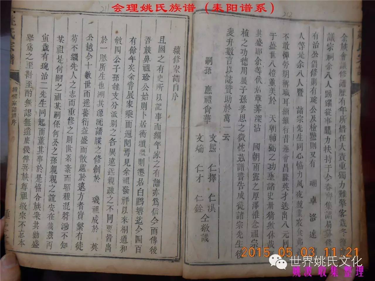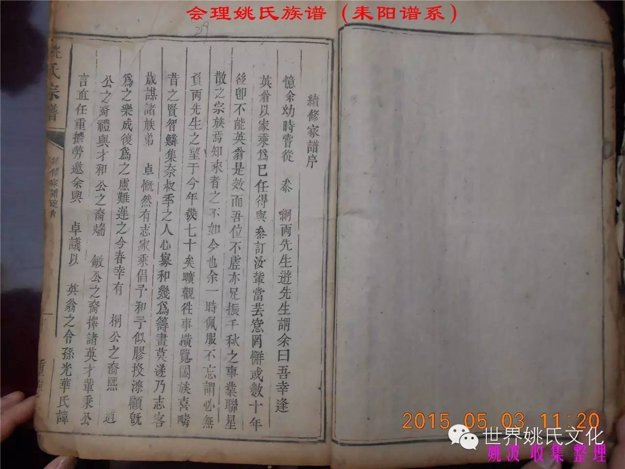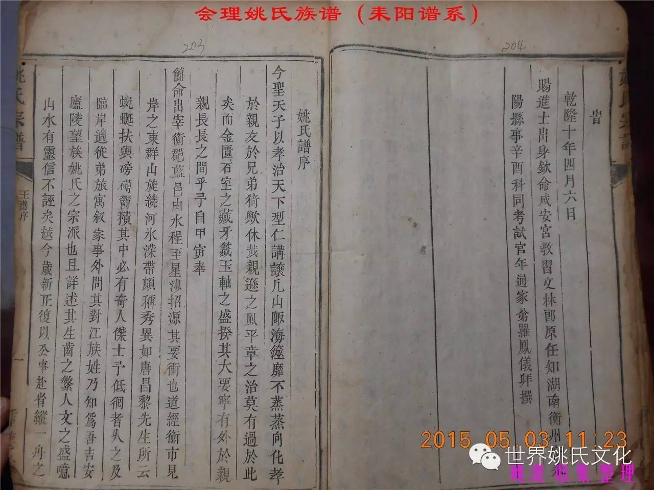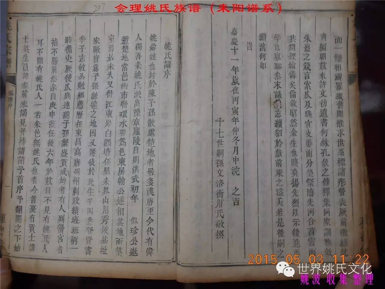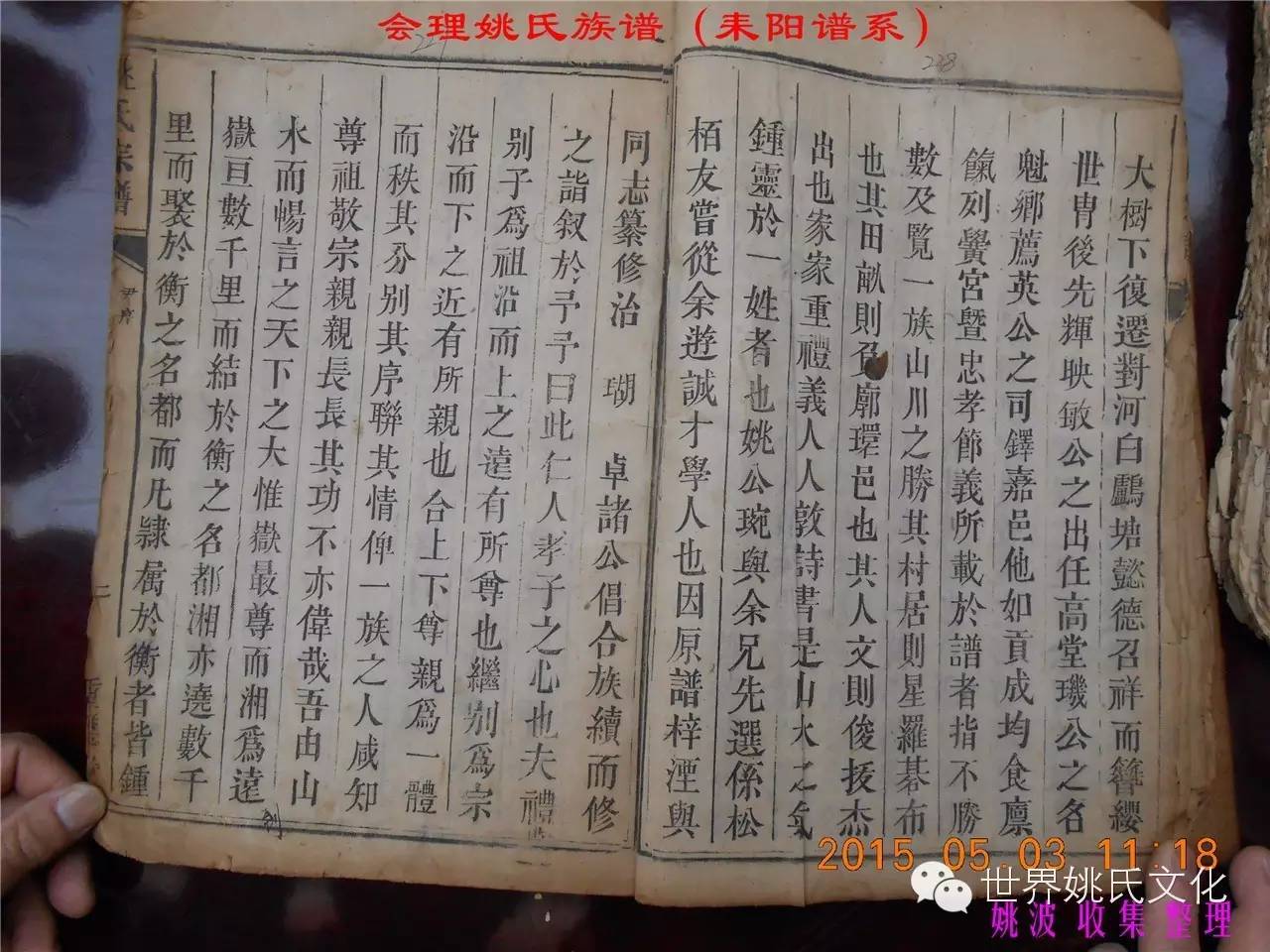 适逢老四川姚会走访攀西姚氏之际,远在湖南衡阳的姚爱平宗亲,不知道是不是凑巧还是知道我们将去会东走访。特别委托我们帮助寻找定居会理州北门的耒阳姚氏族亲。并提供了入川世系和资料。说明了在同治年间有信回籍合谱,但因路途遥远,阻隔回故居合谱。受此之托,所以特别关注来自衡阳的姚氏,在查看到接近中午时候,来自会理的姚孔建宗亲带了两本家谱赶到现场,我也迫不及待打开,刚翻到第一页,就发现耒阳谱序,心中也暗自吃惊,不可能这么有缘千里来相识吧!再看几页,几乎肯定是湖南耒阳姚爱平宗亲要找失散多年的族人。马上急不可耐的和姚爱平宗亲询问和求证,前后也不过两分多钟而已,就这么有缘。在得到肯定答复后,让他们互相发送电话,并通话各自互相问候。久违的乡音,亲切的话语。以至于两地通话结束之后,孔建宗亲又急忙往家中报喜,只听到说...“找到了” “找到了”,“还和他们通话了”。不知是激动,还是感动,其它话语就没法说出来。有感于此;我不得不留下几句,以对分别多年又重逢的感伤。