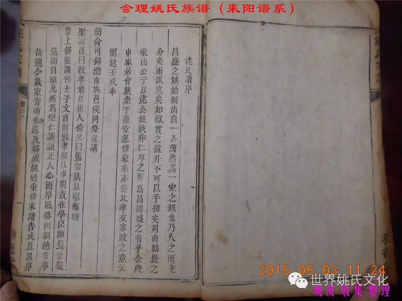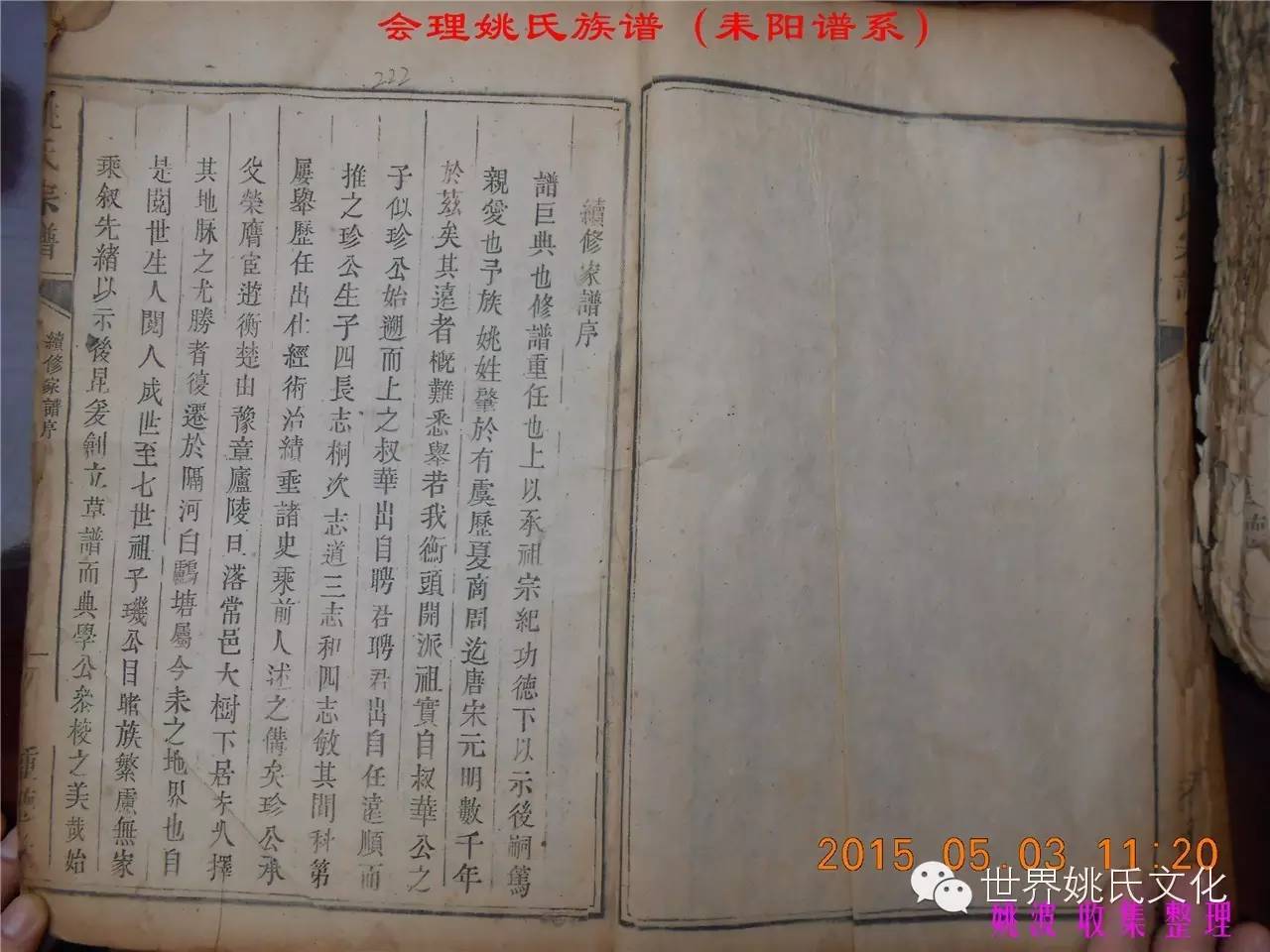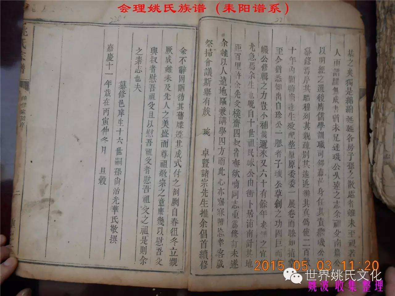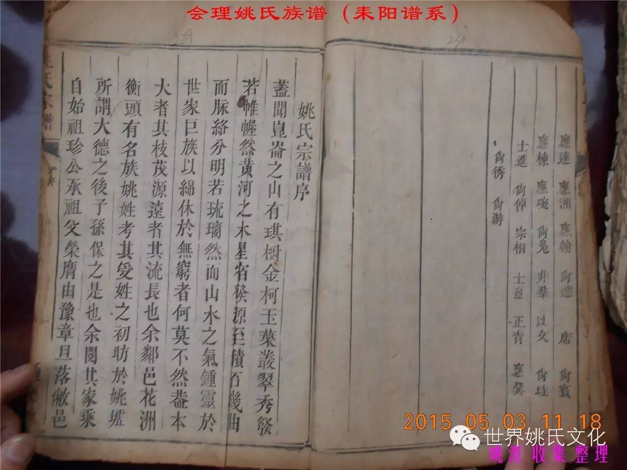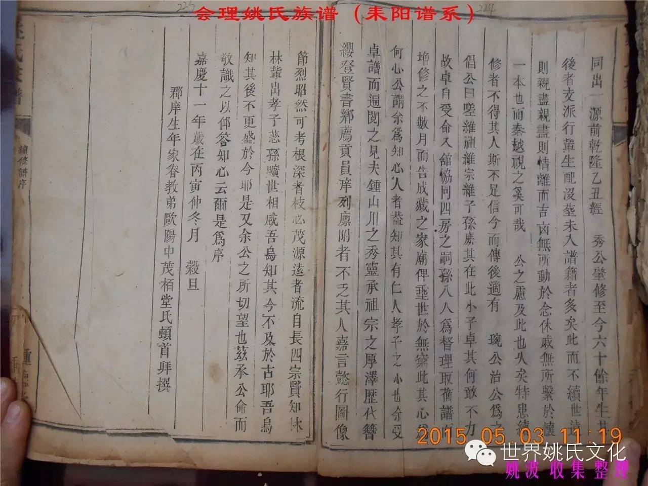 适逢老四川姚会走访攀西姚氏之际,远在湖南衡阳的姚爱平宗亲,不知道是不是凑巧还是知道我们将去会东走访。特别委托我们帮助寻找定居会理州北门的耒阳姚氏族亲。并提供了入川世系和资料。说明了在同治年间有信回籍合谱,但因路途遥远,阻隔回故居合谱。受此之托,所以特别关注来自衡阳的姚氏,在查看到接近中午时候,来自会理的姚孔建宗亲带了两本家谱赶到现场,我也迫不及待打开,刚翻到第一页,就发现耒阳谱序,心中也暗自吃惊,不可能这么有缘千里来相识吧!再看几页,几乎肯定是湖南耒阳姚爱平宗亲要找失散多年的族人。马上急不可耐的和姚爱平宗亲询问和求证,前后也不过两分多钟而已,就这么有缘。在得到肯定答复后,让他们互相发送电话,并通话各自互相问候。久违的乡音,亲切的话语。以至于两地通话结束之后,孔建宗亲又急忙往家中报喜,只听到说...“找到了” “找到了”,“还和他们通话了”。不知是激动,还是感动,其它话语就没法说出来。有感于此;我不得不留下几句,以对分别多年又重逢的感伤。