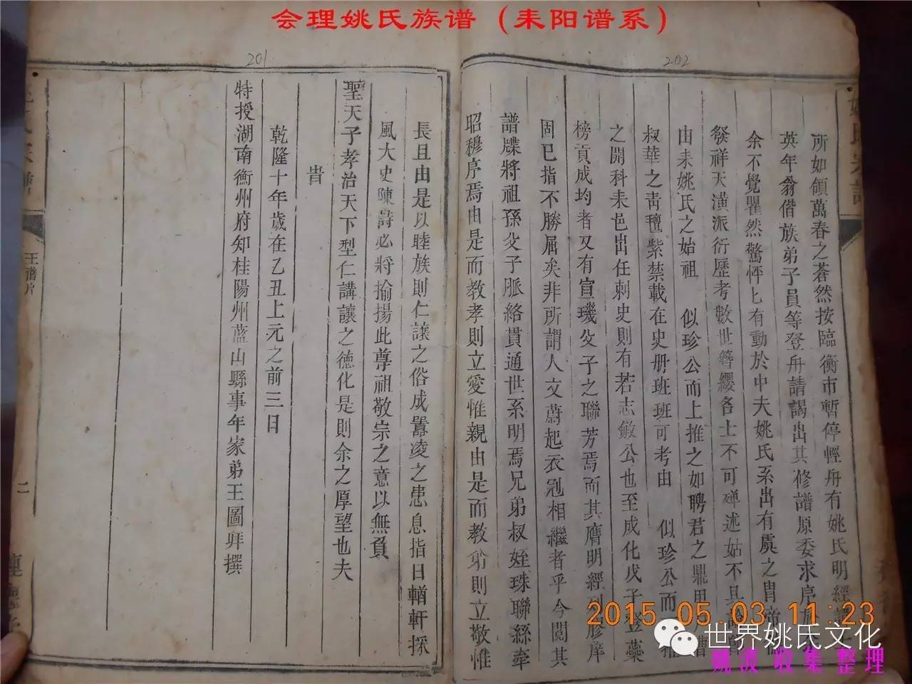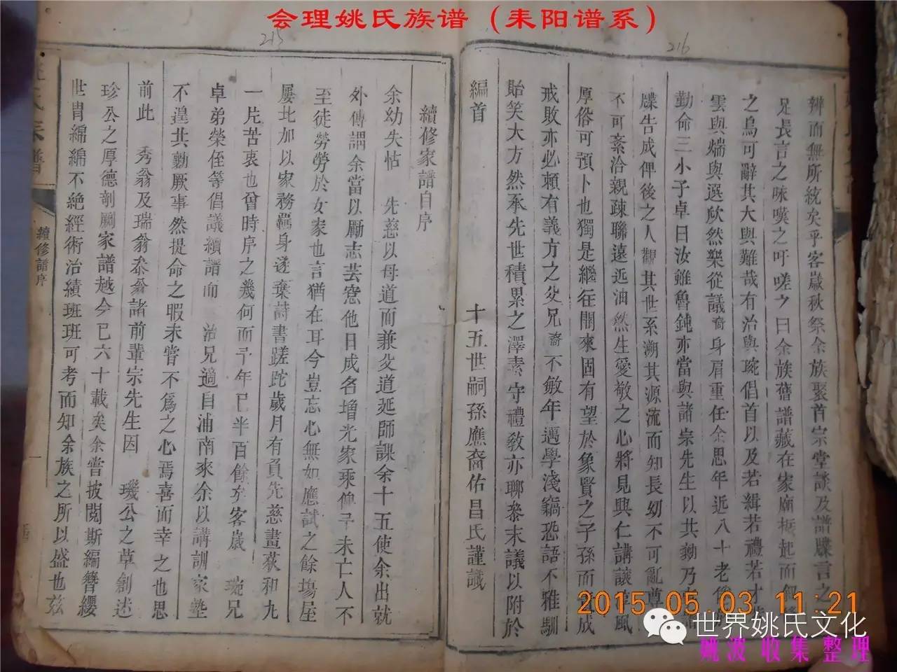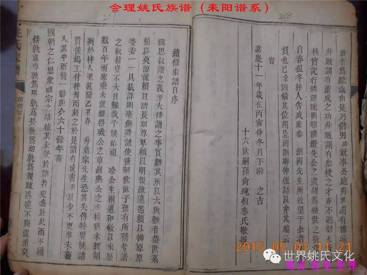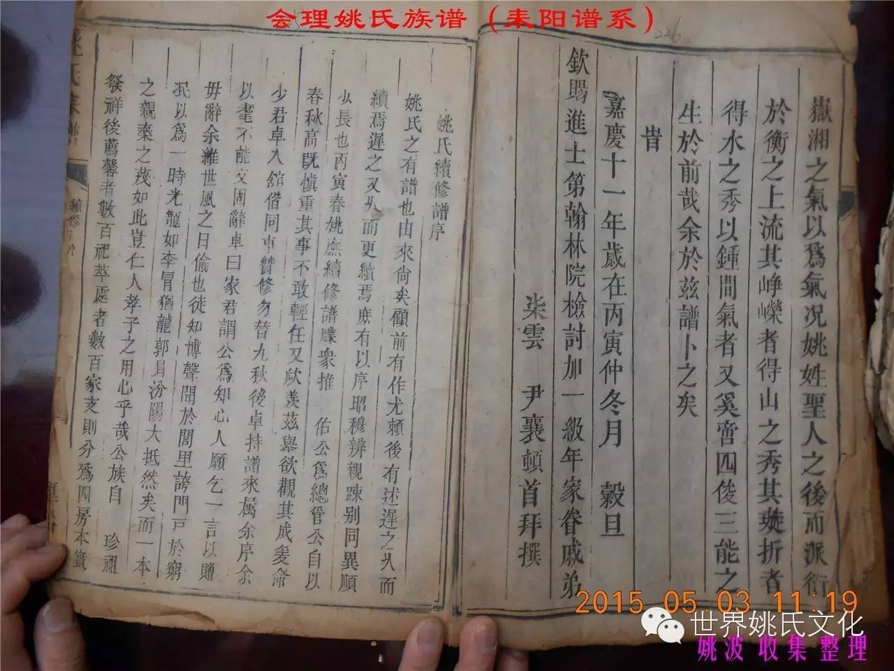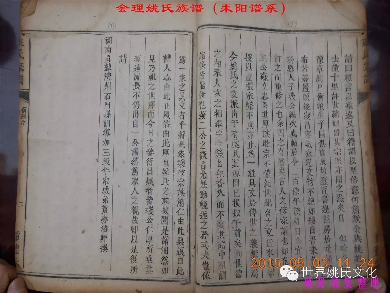 适逢老四川姚会走访攀西姚氏之际,远在湖南衡阳的姚爱平宗亲,不知道是不是凑巧还是知道我们将去会东走访。特别委托我们帮助寻找定居会理州北门的耒阳姚氏族亲。并提供了入川世系和资料。说明了在同治年间有信回籍合谱,但因路途遥远,阻隔回故居合谱。受此之托,所以特别关注来自衡阳的姚氏,在查看到接近中午时候,来自会理的姚孔建宗亲带了两本家谱赶到现场,我也迫不及待打开,刚翻到第一页,就发现耒阳谱序,心中也暗自吃惊,不可能这么有缘千里来相识吧!再看几页,几乎肯定是湖南耒阳姚爱平宗亲要找失散多年的族人。马上急不可耐的和姚爱平宗亲询问和求证,前后也不过两分多钟而已,就这么有缘。在得到肯定答复后,让他们互相发送电话,并通话各自互相问候。久违的乡音,亲切的话语。以至于两地通话结束之后,孔建宗亲又急忙往家中报喜,只听到说...“找到了” “找到了”,“还和他们通话了”。不知是激动,还是感动,其它话语就没法说出来。有感于此;我不得不留下几句,以对分别多年又重逢的感伤。
