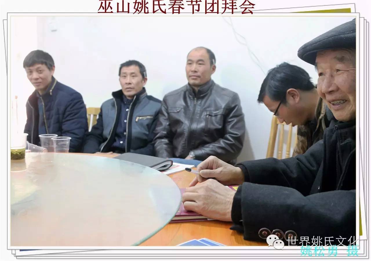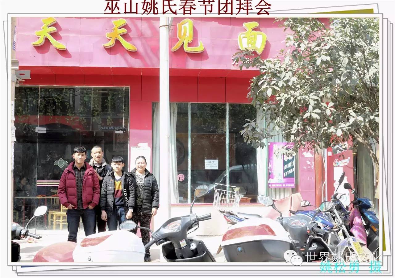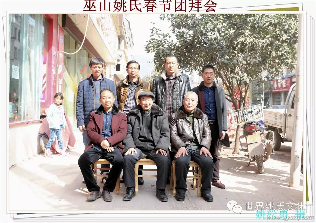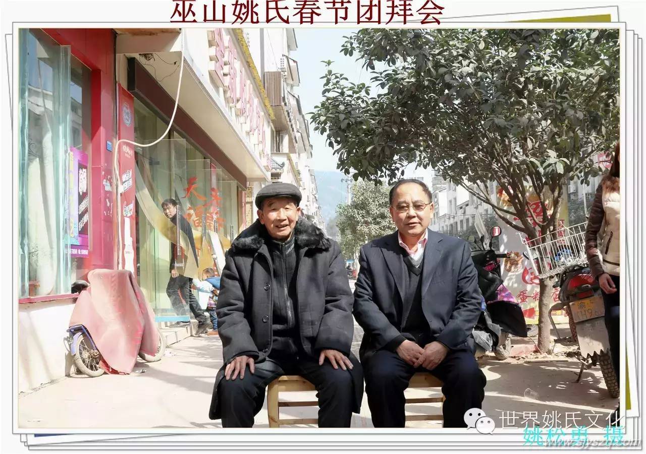 参加团拜会都是入川祖姚仕荣后裔,仕荣生七子:应举、应龙、应凰、应虎、应凤、应付、应科。到了5个房系的后人,还有4房,6房的后人没到,不知去向,有待寻找。当日天气晴朗,春意盎然,也是一个好日子,有许多结婚的都是选订的吉祥日子。团拜会是在姚元海宗亲开的“天天见面”的面馆内举行。新年喜气祥和,同迎新春,共叙情谊,通过举办联谊会,让宗亲们欢聚一堂,互相认识,加强沟通,加深感情。族亲共话家乡发展的美好愿景,希望在外务工和创业的族贤交流经验,多关心家乡发展。 姚松勇和姚元超族长合影【82岁,退休老干部,热心于家族事业】 巫山姚氏简表