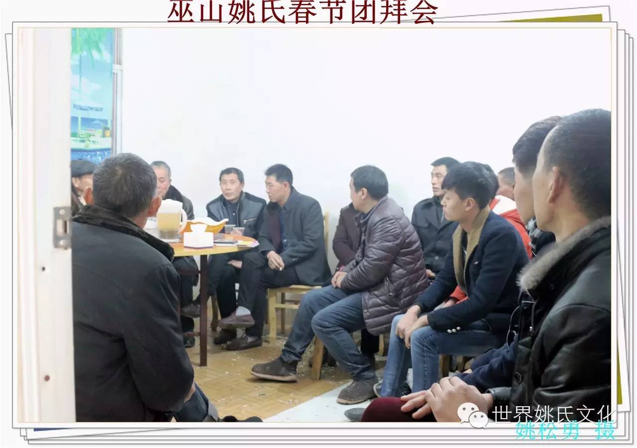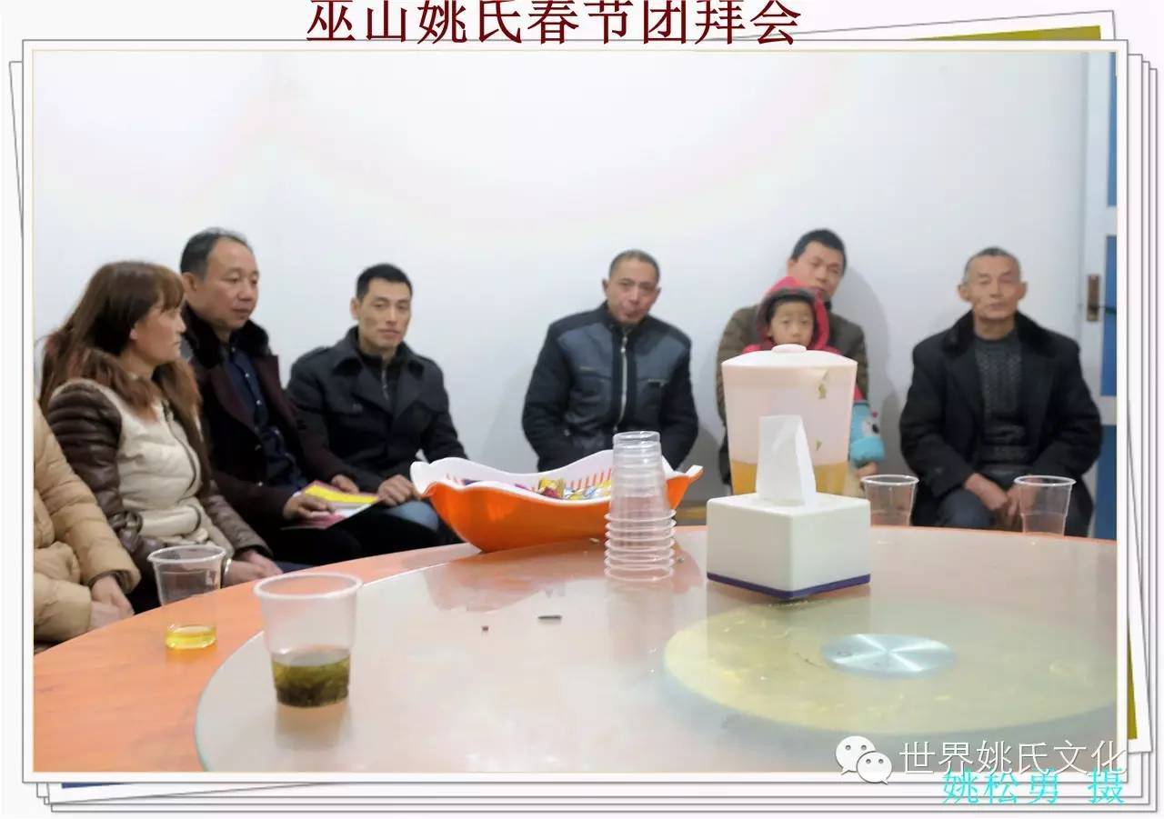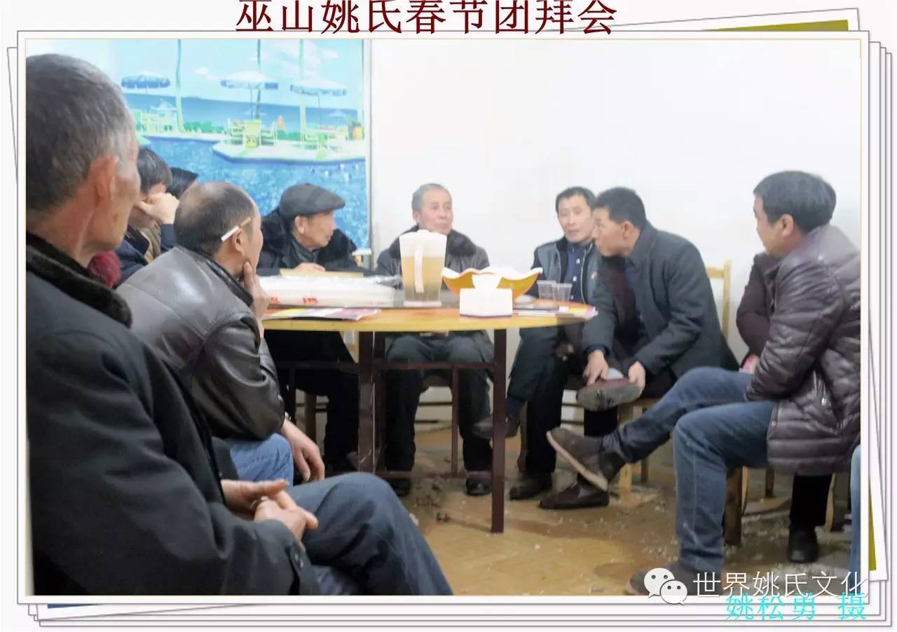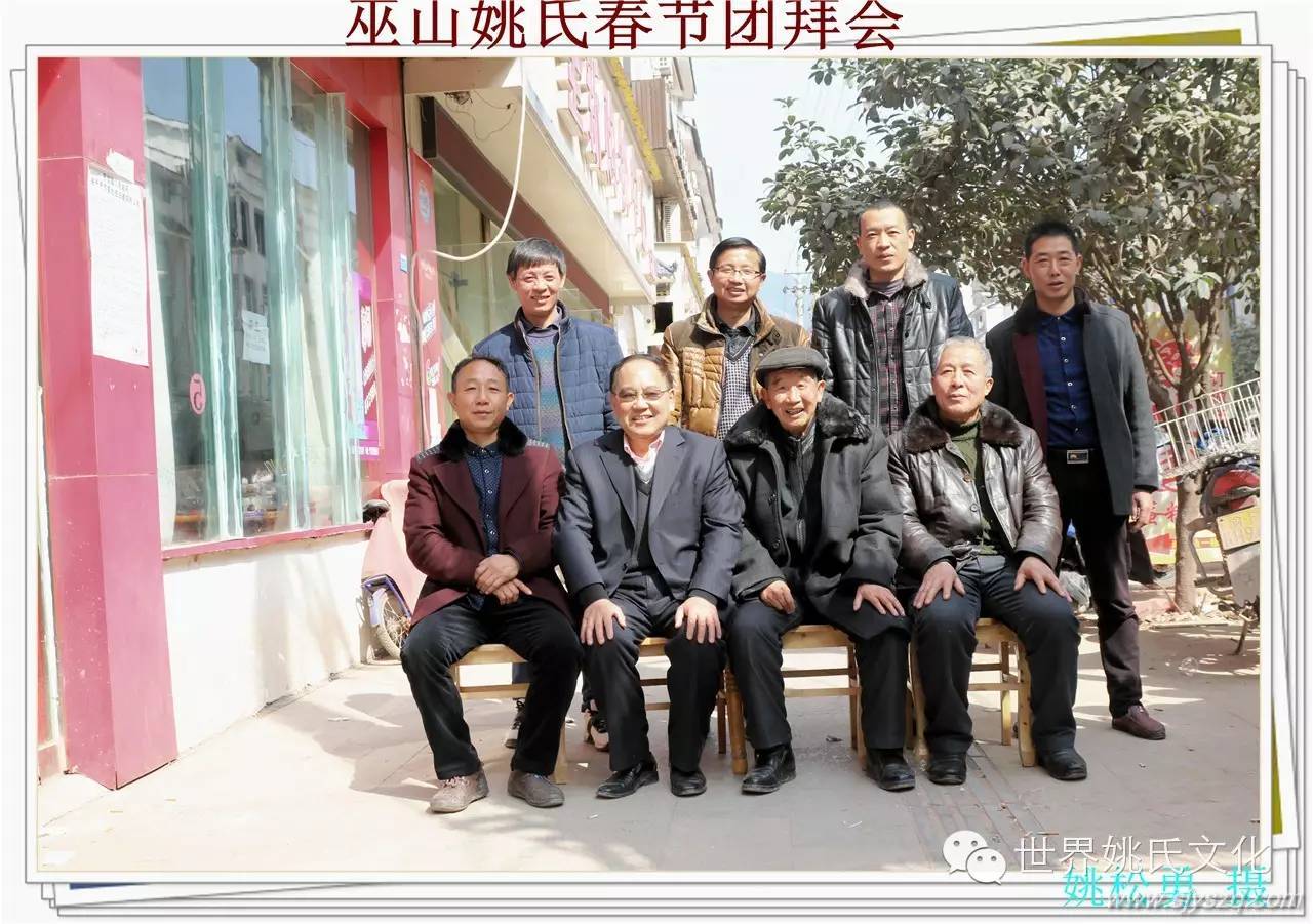 参加团拜会都是入川祖姚仕荣后裔,仕荣生七子:应举、应龙、应凰、应虎、应凤、应付、应科。到了5个房系的后人,还有4房,6房的后人没到,不知去向,有待寻找。当日天气晴朗,春意盎然,也是一个好日子,有许多结婚的都是选订的吉祥日子。团拜会是在姚元海宗亲开的“天天见面”的面馆内举行。新年喜气祥和,同迎新春,共叙情谊,通过举办联谊会,让宗亲们欢聚一堂,互相认识,加强沟通,加深感情。族亲共话家乡发展的美好愿景,希望在外务工和创业的族贤交流经验,多关心家乡发展。 姚松勇和姚元超族长合影【82岁,退休老干部,热心于家族事业】 巫山姚氏简表