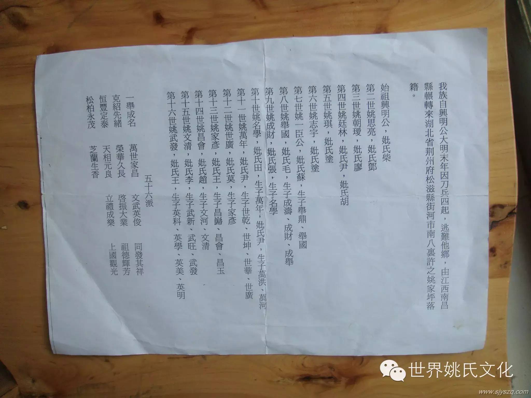 巫山姚氏始祖姚泽彰子姚国帧,入川祖姚仕荣以下辈分:仕应正均瑞,家义万元昌,兴裕光天德,魁圣一朝长,文从绍启秀,世代永同邦。在遗簿纸上看到是湖北松滋迁徙到巫山,祖坟上有同样记载,又有从江西南昌迁徙来的记载。到过松兹寻根问祖,辈份又不同,接不上,通过报道后,希望得到姚氏宗亲的关注,找到自己的根源。