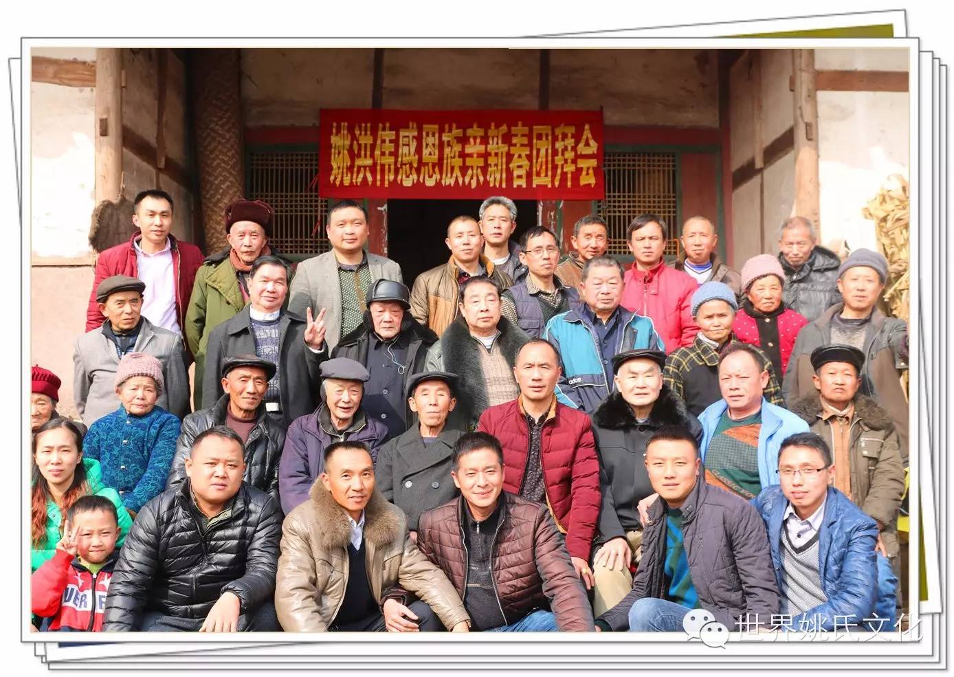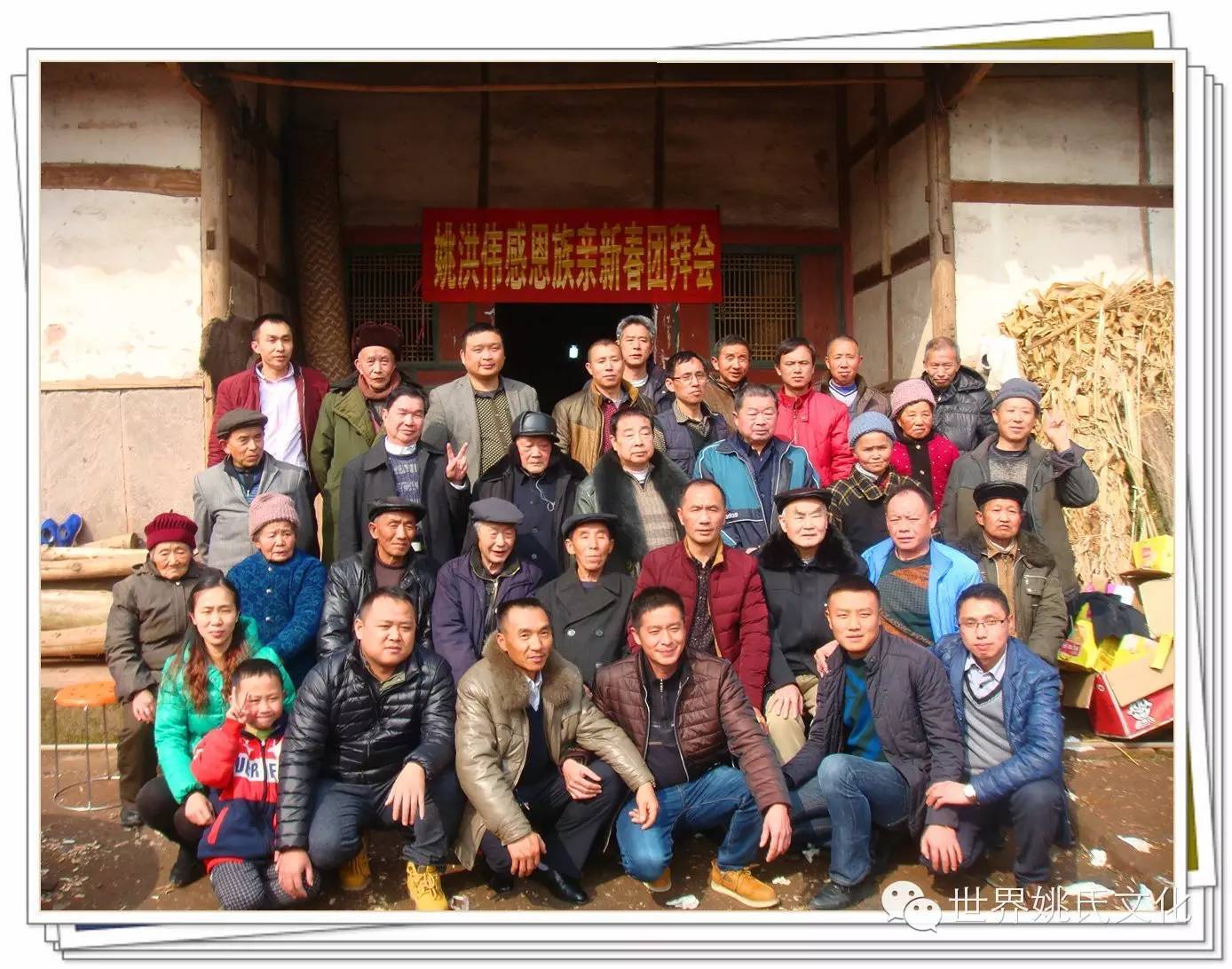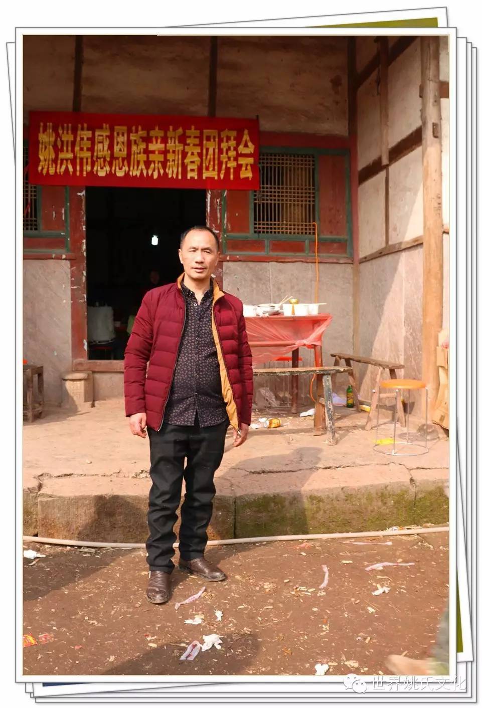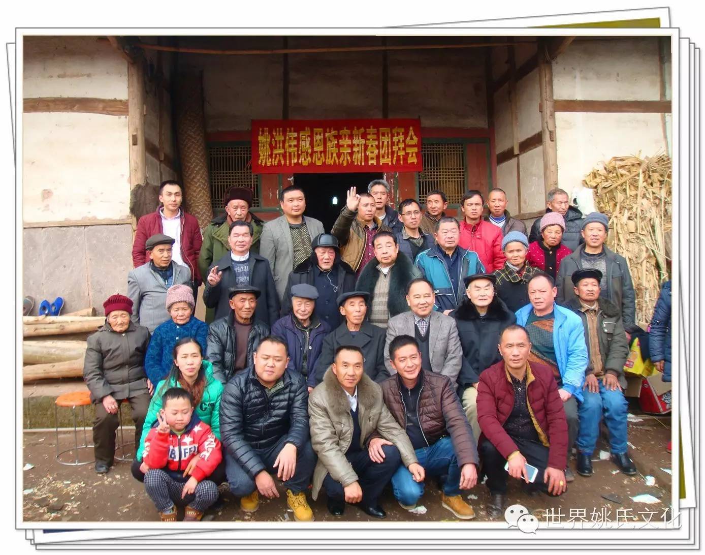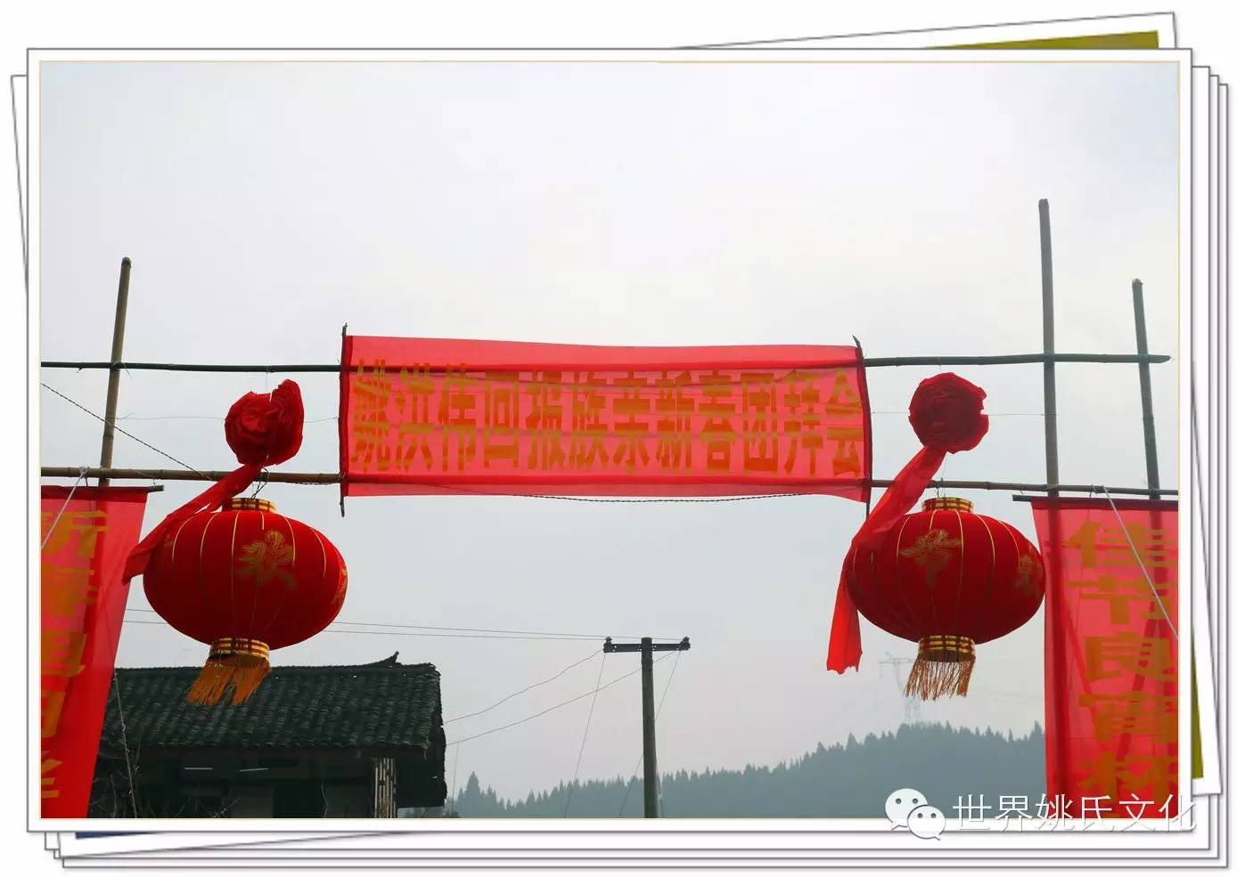 2016年2月4日,农历腊月26日,南充市高坪南江乡五村一社姚家大院门口矗立着灿烂醒目的牌坊,上面写着“姚洪伟猴年新春团拜会”,两边贴着工整的对联,《佳节良宵杯杯美酒恭敬亲友 新春旭日丝丝心勰感恩故乡》!横幅两边是两朵鲜艳的大红花,下面挂着两盏大红灯笼,十分引人注目。