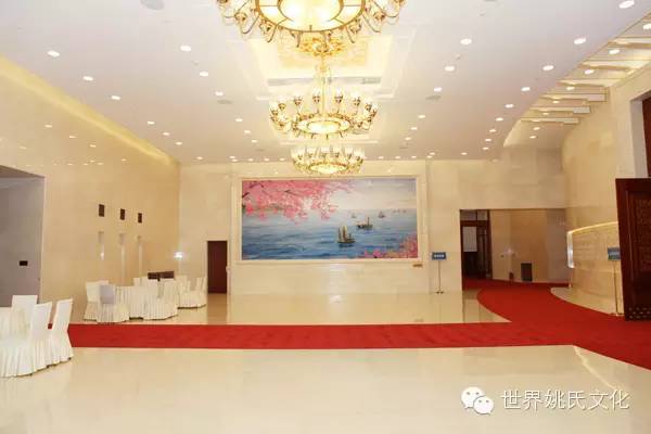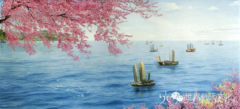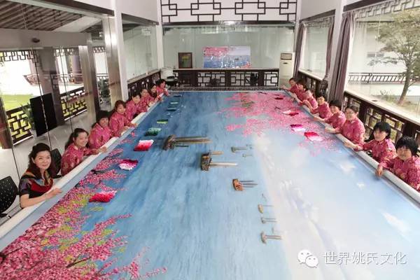 苏绣作品《海纳百川》幅面尺寸达到了486cm X 231cm,此作品是由中南海通过江苏省人大委托给姚建萍刺绣艺术有限公司所创作,由苏绣国家级非物质文化遗产传承人姚建萍带领46名苏绣技师,历时5个月创作完成。作品一改传统苏绣的精细雅洁,针笔着眼突出其磅礴的气势,广阔的胸怀,这对苏绣技艺是一次新的突破,受到了众多领导及专家的大力褒扬。