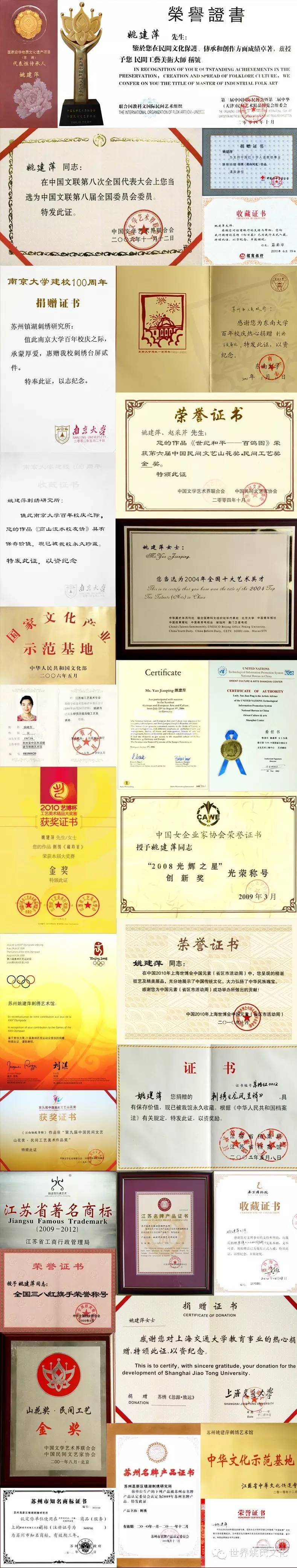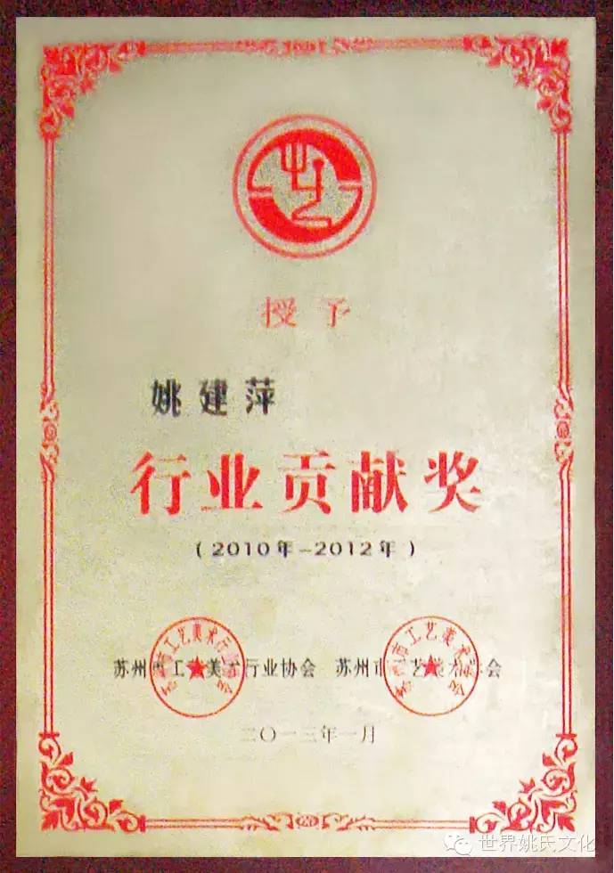 苏绣艺术家姚建萍荣获2010-2012年度苏州市工艺美术“行业贡献奖”。
