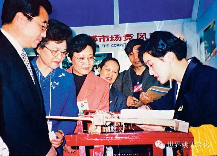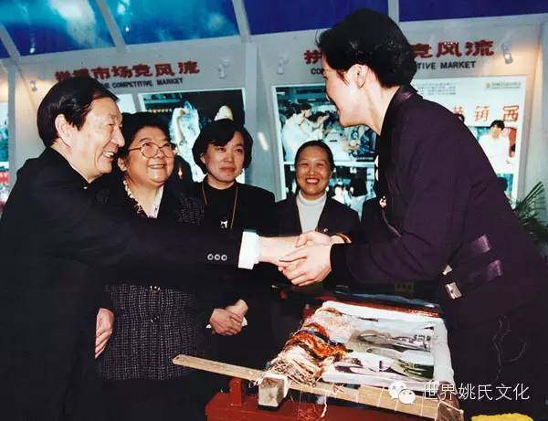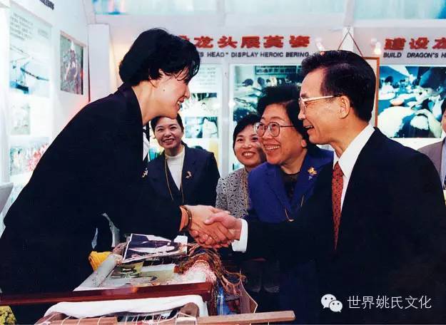 前中共中央政治局常委、国务院总理朱镕基观看姚建萍的刺绣表演,与姚建萍亲切握手。