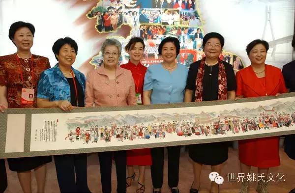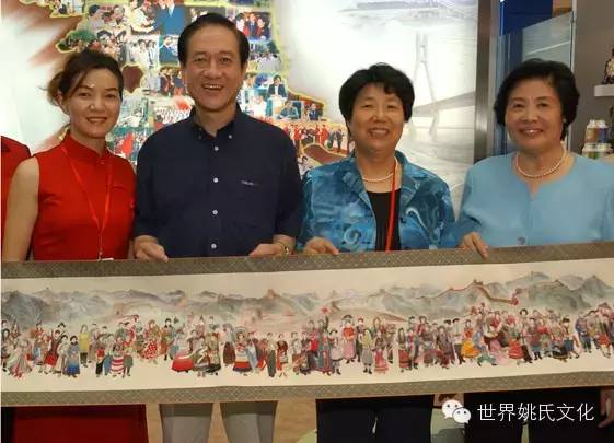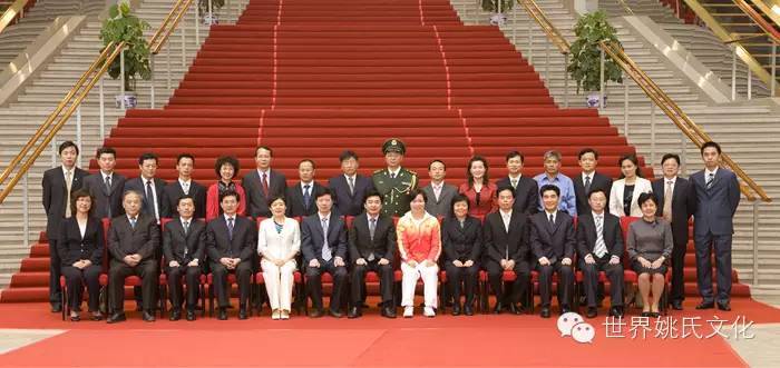 2005年8月,全国人大常委会副委员长韩启德、江苏省副书记张连珍等与苏绣巨作《我爱中华》合影留念。