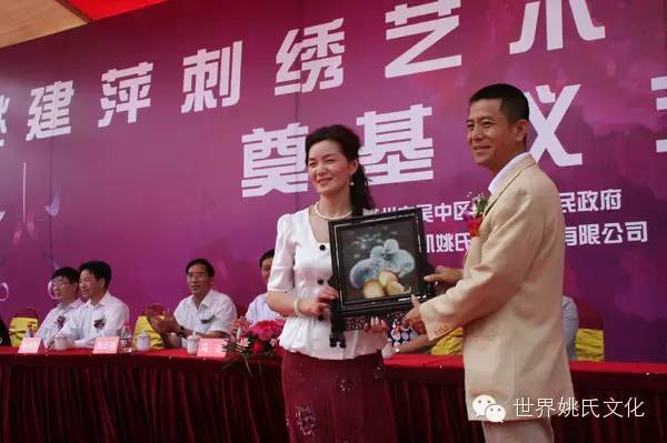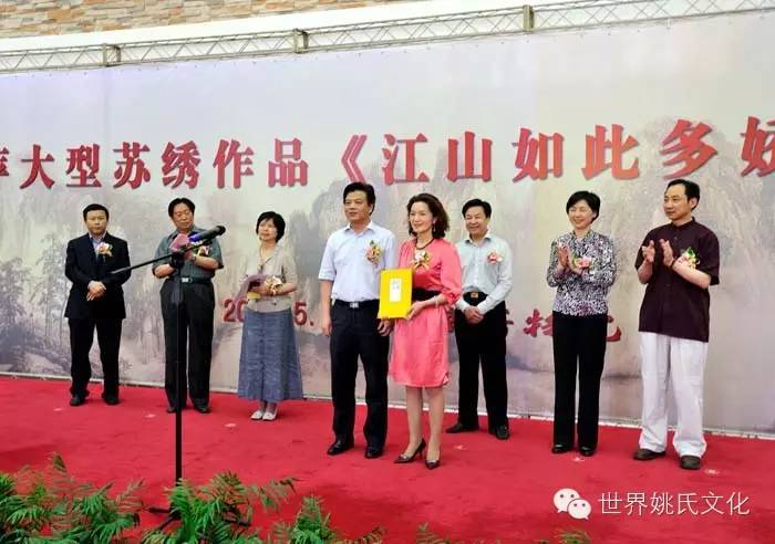 2011年5月18日,大型原创苏绣作品《江山如此多娇》被南京博物院永久收藏。江苏省委宣传部副部长梁勇、省文物局局长、南京博物院院长龚良、省妇联副主席李蓁、省政协副秘书长、江苏民进主委徐菊英、中国著名花鸟画家喻继高、省民间文艺家协会副主席张丹等出席。图为省委宣传部副部长梁勇向姚建萍颁发证书。