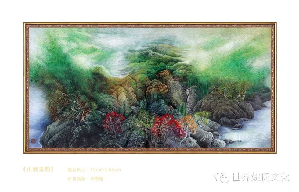 本作品画理与绣理有机结合,首次用细乱针法表现古山水画。在作品古画色调的处理上,精心运用姚氏“压光绣”技法,消除丝线反光的难题。同时使用丝理走势的方法,表现古山水画的朴拙韵味。精细表达了原作墨色的干湿浓淡,再现了山形树姿的纹理,丘陵山景的野趣,把一幅形、神兼备的《富春山居图》生动呈现在人们眼前。