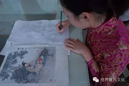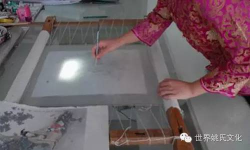 勾稿:从设计完成的绣稿上,用毛笔或铅笔勾勒出一张黑白的单或双的线条或虚线条的轮廓稿。