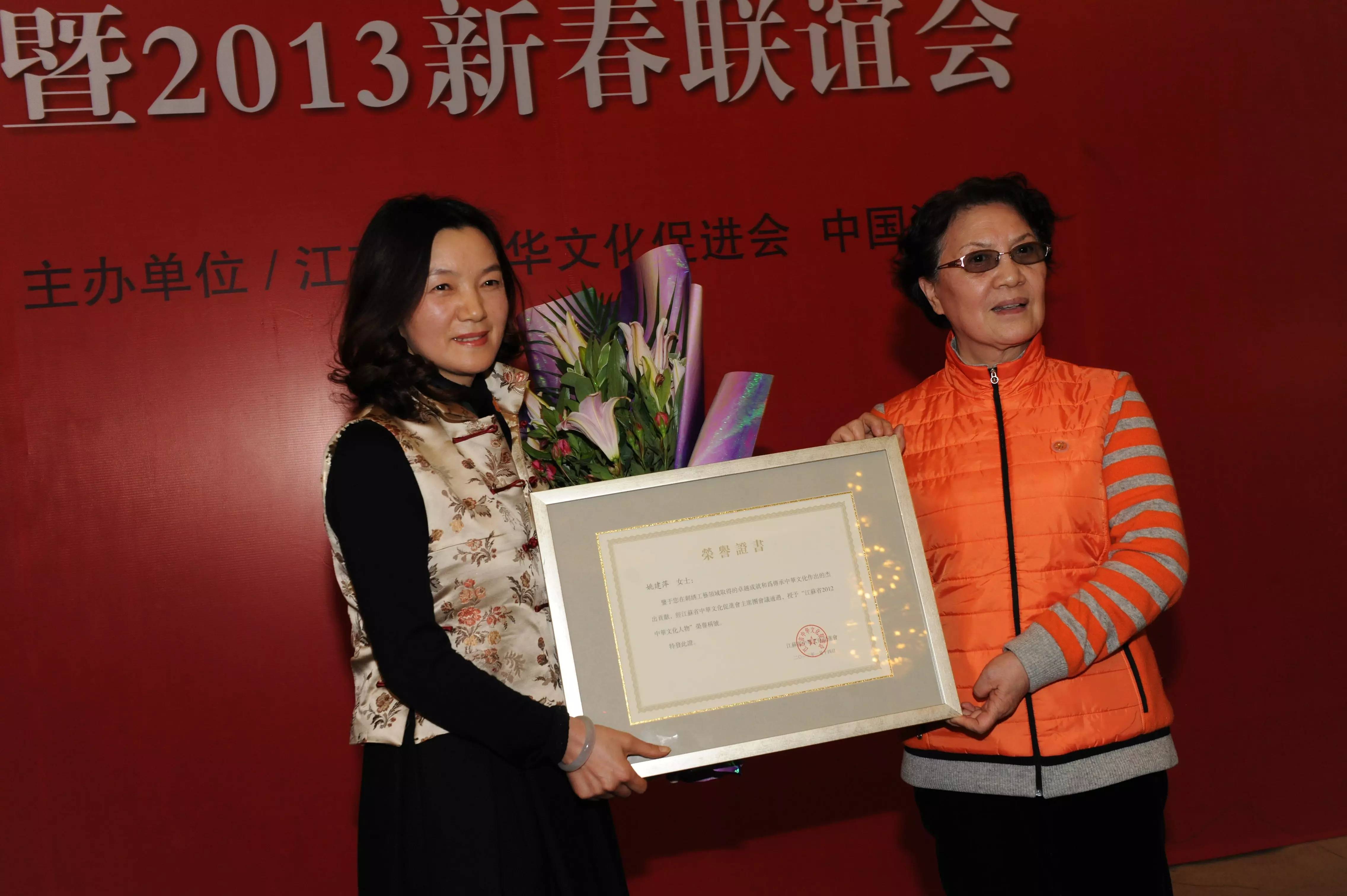 2013年1月14日下午,由江苏省中华文化促进会、中国江苏网联合主办“江苏省2012中华文化人物”颁授典礼在苏宁环球大酒店卢浮宫厅举行。江苏省人大常委会副主任赵龙,江苏省政协副主席周珉、黄因慧,江苏省委原书记、省中华文化促进会名誉主席陈焕友,南京军区原政委、省中华文化促进会名誉主席方祖岐上将,江苏省委原副书记、省中华文化促进会主席顾浩等领导,以及两百多名江苏著名文化学者、艺术家参加了颁授活动。