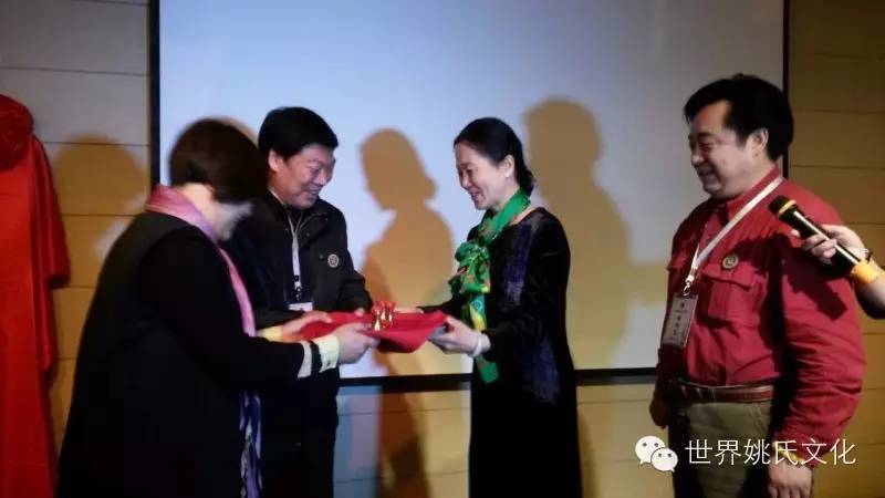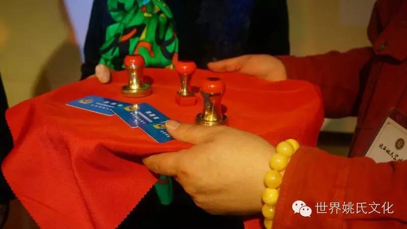 第九项:陕西姓氏文化研究会会长李丽玮、秘书长姚鸿文将印章交予陕西姚氏宗亲会会长姚文礼、秘书长姚喜荣。