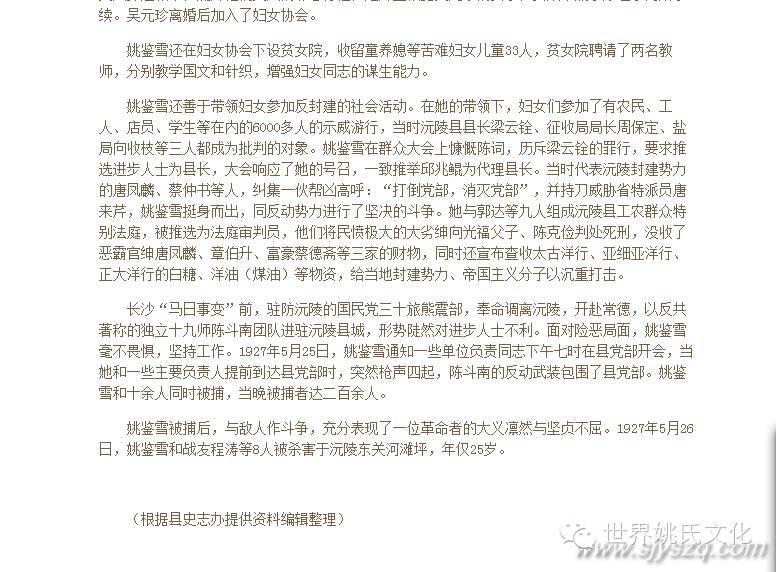 姚鉴雪,女,清光绪二十八年生于湖南省沅陵县浦市镇(现属泸溪县),后举家迁居沅陵县城北门上。民国7年(1918),考入湖南省立第二女子师范学校。次年,举国声讨北京政府承认日本接管德国在我国山东的各种特权的卖国罪行。鉴雪和同学们上街游行示威,高呼“惩治卖国贼!”“废除丧权辱国的二十一条!”姚鉴雪从女师毕业后回沅陵,任县立高等女子小学教员。民国12年获湖南省教育厅嘉奖。