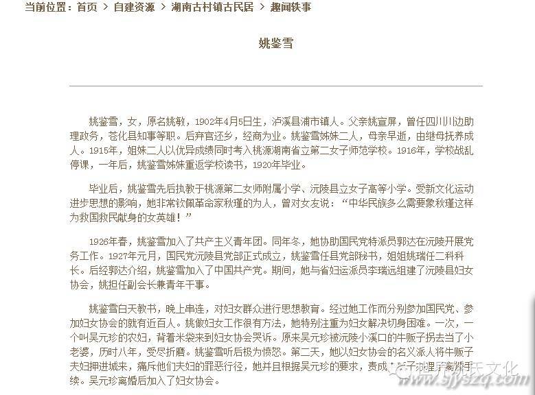 史载,1927年5月,长沙“马日事变”后,国民党左派人士、坚定的革命者、沅陵一代才女姚鉴雪,被沅陵军阀陈斗南(时任湘西巡防军独立旅旅长)杀害。鉴雪被杀后,凶手们将其裸体暴尸,并在其下身插进一根木棍!