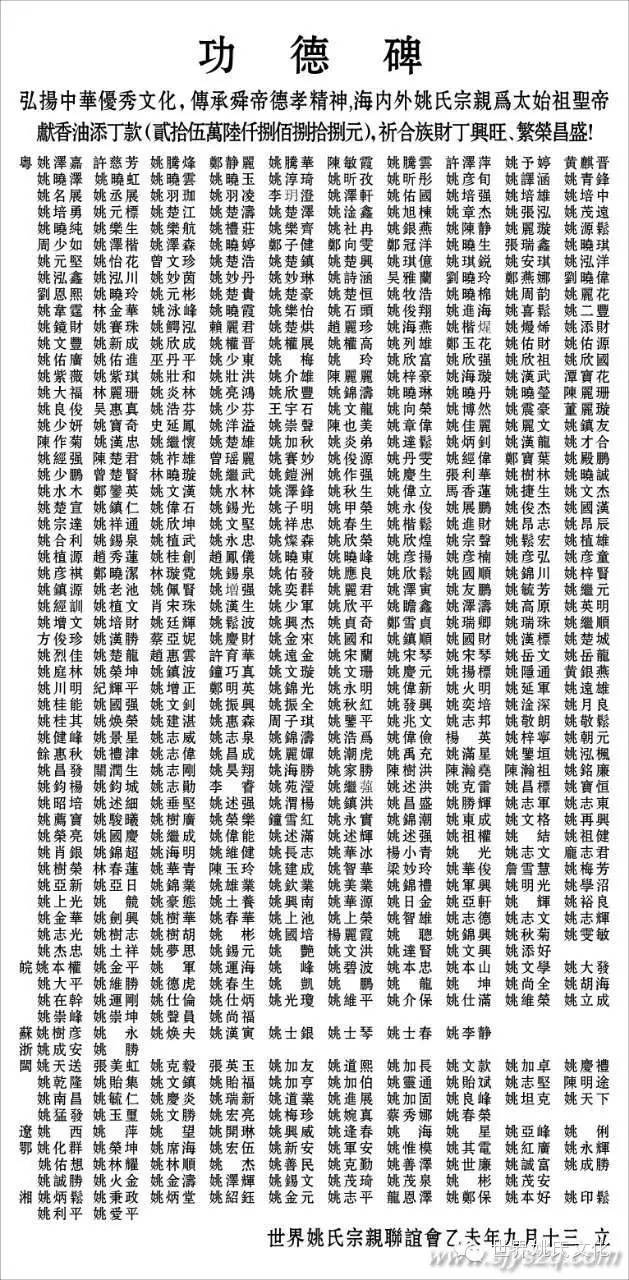 功德碑弘扬中华优秀文化,传承舜帝德孝精神,海内外姚氏宗亲为太始祖圣帝献香油添丁款(貳拾伍万陆仟捌佰捌拾捌元),祈 合族财丁兴旺、繁荣昌盛!
