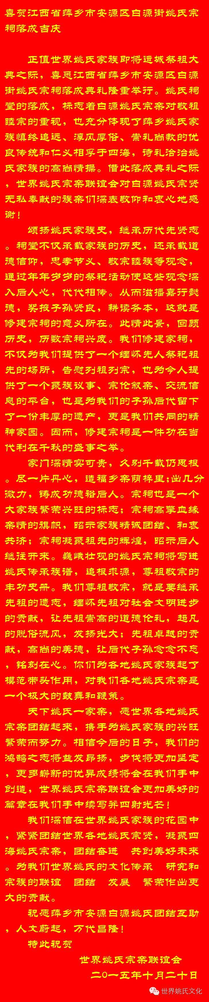 祝愿萍乡市安源白源姚氏团结互助,人文蔚起,万代昌隆!