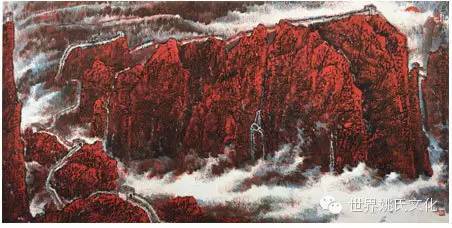 泼墨是大写意的一种画法。是指落笔大胆、点染淋漓、水墨浑融、气势磅礴的写意技法。在中国画《巨龙雄魂》中,姚老师用他擅长的泼墨写意画法,豪放、随意、洒脱地描绘长城。画家笔下的长城像一条白色巨龙翻腾于苍山红海之间,通过面与线、红与白、厚与薄的种种对比,展示那浓缩的沧桑历史,凸现我中华民族之脊梁。