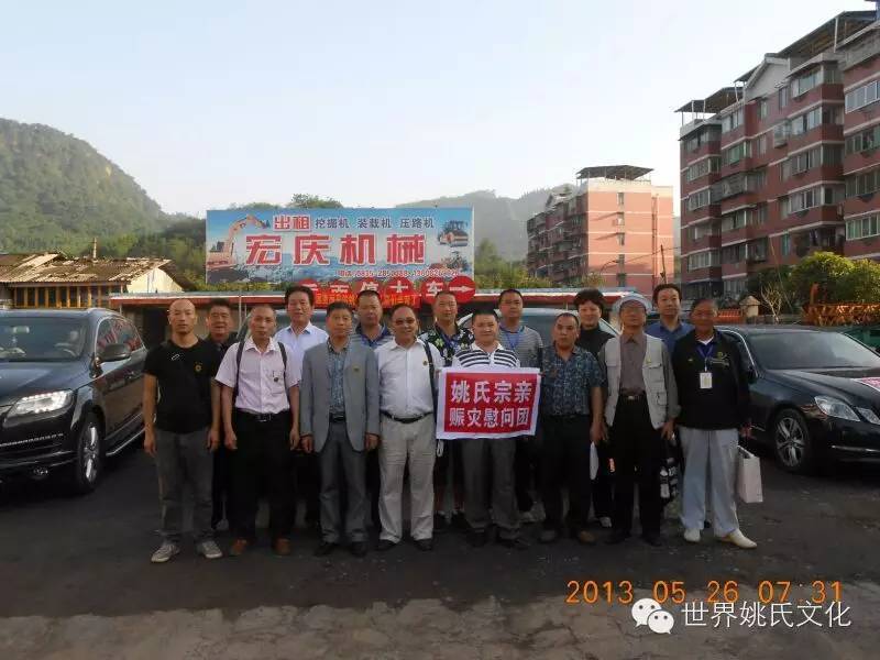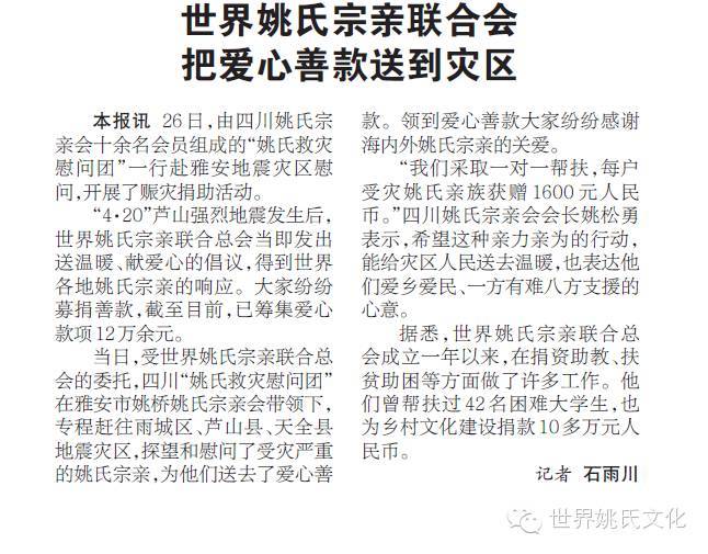 “4·20”芦山强烈地震发生后,世界姚氏宗亲联合总会当即发出送温暖、献爱心的倡议,得到世界各地姚氏宗亲的响应。大家纷纷募捐善款,截至目前,已筹集爱心款项12万余元。