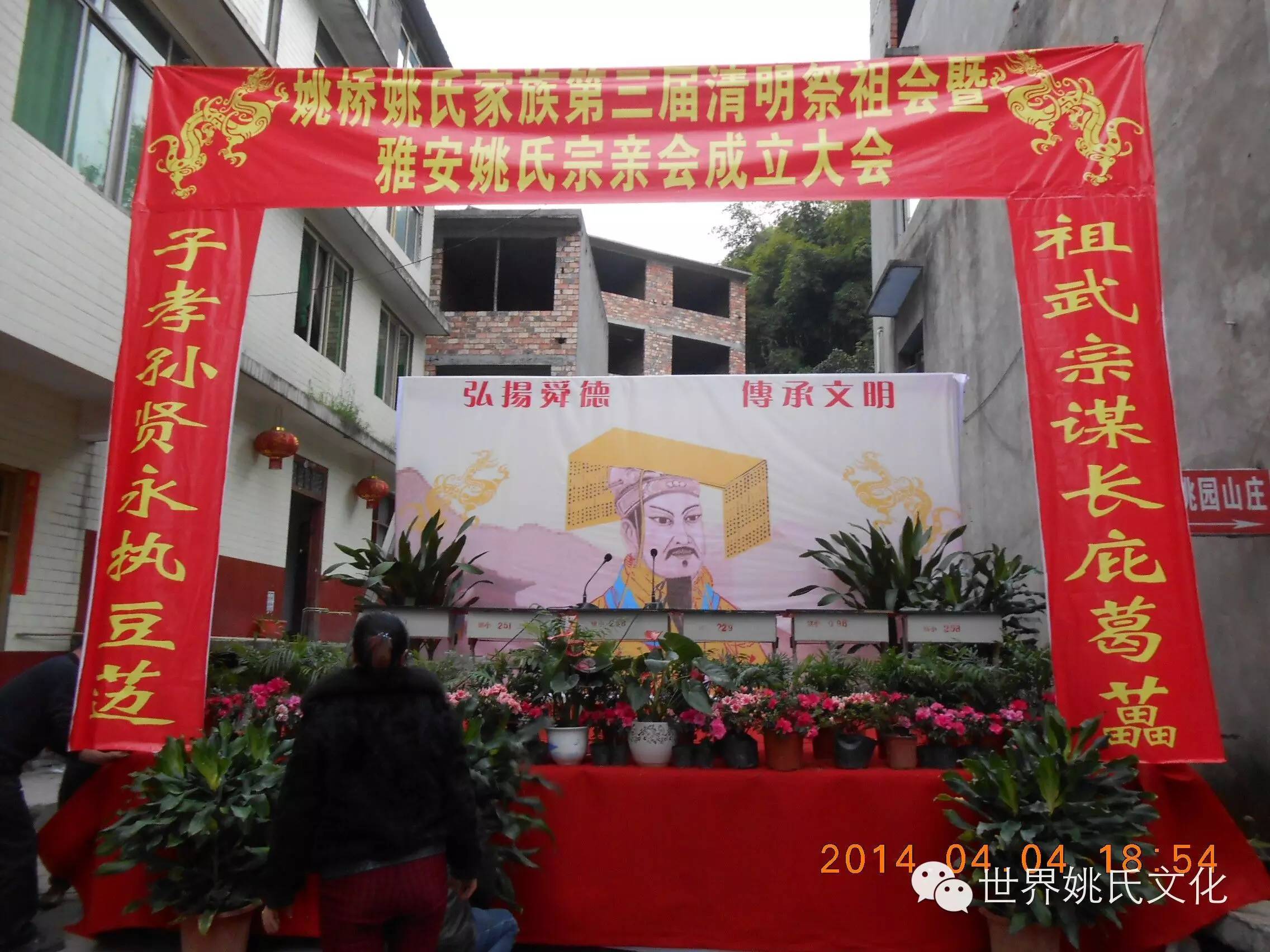 今年雅安姚氏是特别的一届,在清明节期间一并成立雅安姚氏宗亲联谊会,届时各地雅安姚氏宗亲将欢聚姚桥。雅安姚氏宗亲联谊会成立,标志着雅安姚氏宗族将有一个新的起点,宗亲组织在实际行动中都发挥了很好的凝聚族人的作用。所以希望这次雅安姚氏宗族以此为起点,在寻根溯源,搜集族史资料、缅怀祖先,发扬祖宗优良传统,联络全国各地宗族,组织有益族务活动方面发挥重要作用。阖族团结一致开辟宗族的光辉前景,共同书写雅安姚氏宗族历史的新篇章。