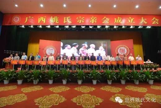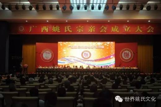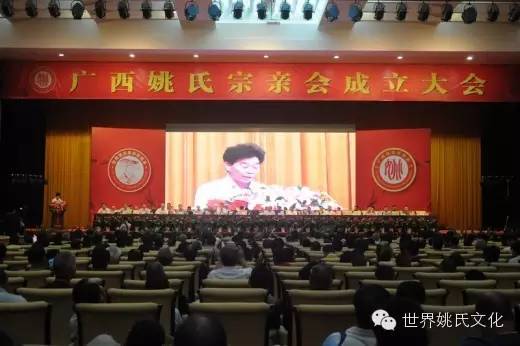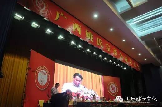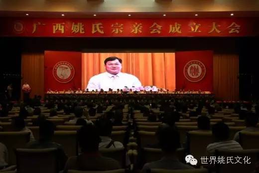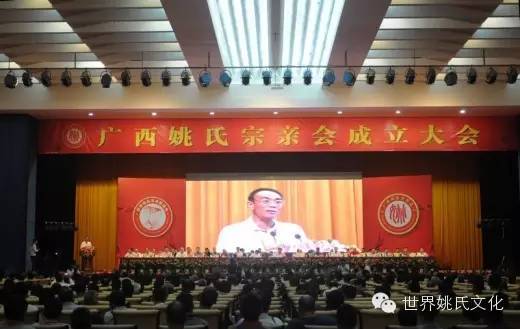 2014年11月29日,世界姚氏宗亲联谊会第二次大会暨广西姚氏宗亲会成立大会在广西壮族自治区南宁市荔园山庄隆重举行,来自全国各地的300多名“世姚会”代表及广西各地市600多名姚氏宗亲出席了这个盛会。世界姚氏宗亲联谊会及四川、湖北、河南、贵州、海南、陕西、江西、上海、云南等姚氏宗亲组织纷纷发来贺电。