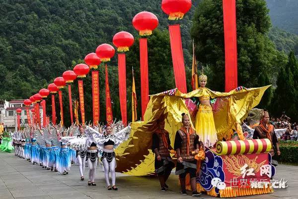(由禽鸟百兽组成的乐舞告祭表演队簇拥着舜帝的化身—一只3米多高的大凤凰,引领主祭队伍,缓缓向前。)