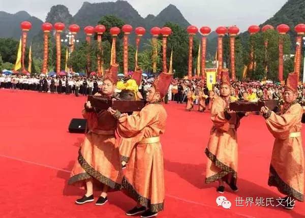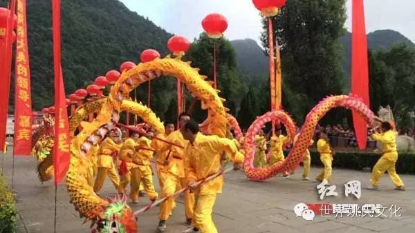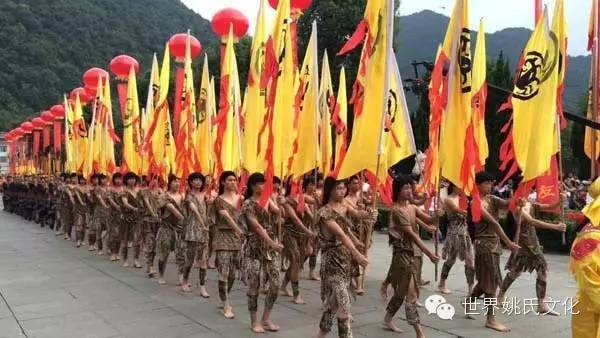 2015湖南省公祭舜帝大典:九龙柱下龙狮劲舞,身着民族服饰的瑶家青年男女分列两侧,伴随着铿锵的鼓声,舞起热烈的长鼓,长号队、莲船队、蚌壳队、民俗队依次排列,以最高的礼节喜迎八方嘉宾,主祭团在一片喜庆气氛中缓缓步行至明德广场。
