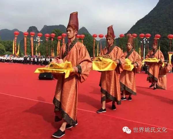 2015湖南省公祭舜帝大典:16名礼生向舜帝敬献三牲、五谷、百果,表达后人对舜帝的虔诚之心。